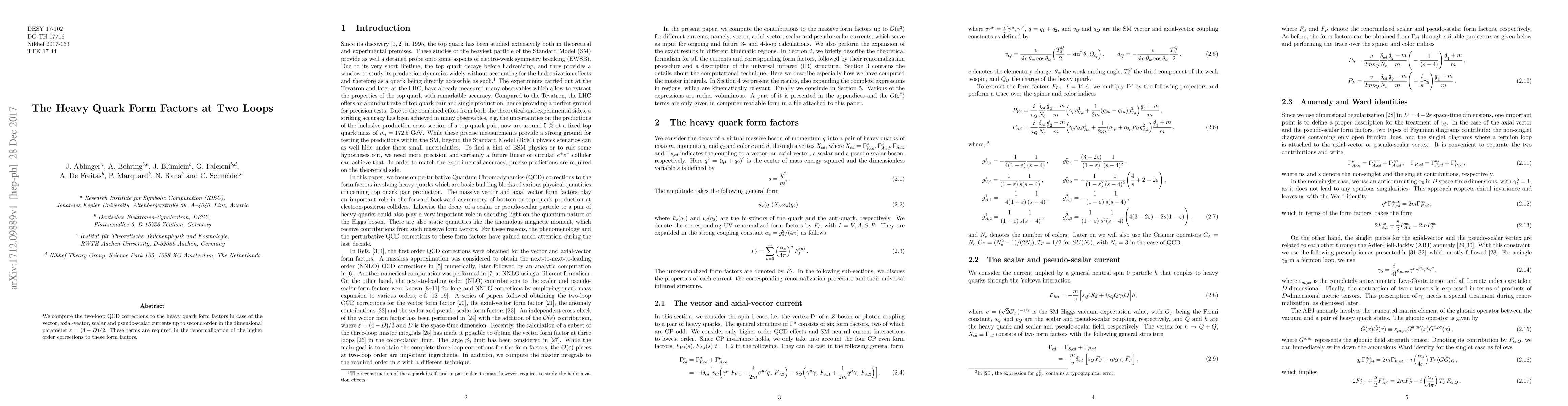 This paper calculates the two-loop Quantum Chromodynamics (QCD) corrections to heavy quark form factors for vector, axial-vector, scalar, and pseudo-scalar currents, up to second order in the dimensional parameter $\epsilon$. These corrections are essential for the renormalization of higher-order corrections to the form factors.