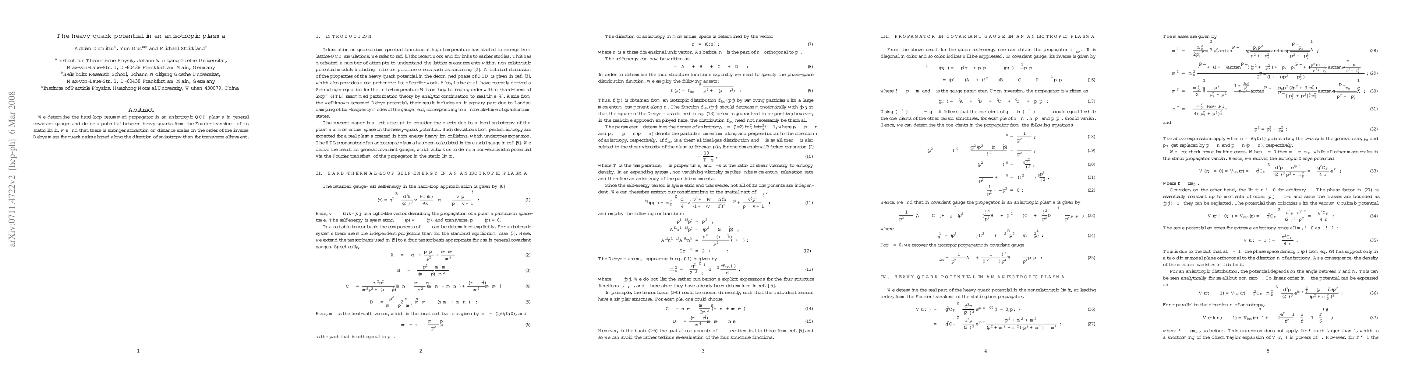 The paper presents the anisotropic heavy-quark potential in covariant gauge, including explicit expressions for mass terms dependent on the anisotropy parameter ξ.