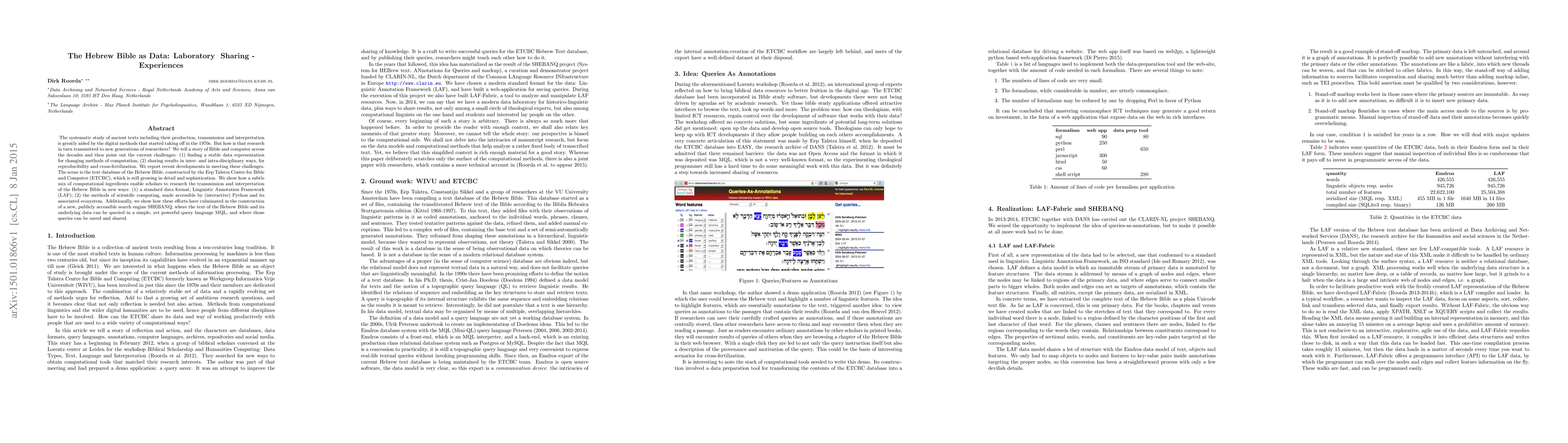 This paper discusses the application of digital methods to study ancient Hebrew Bible texts, focusing on the ETCBC's text database. It highlights challenges in data representation and interdisciplinary sharing, and introduces new tools like the LAF, Python, and the SHEBANQ search engine to facilitate research and reproducibility.