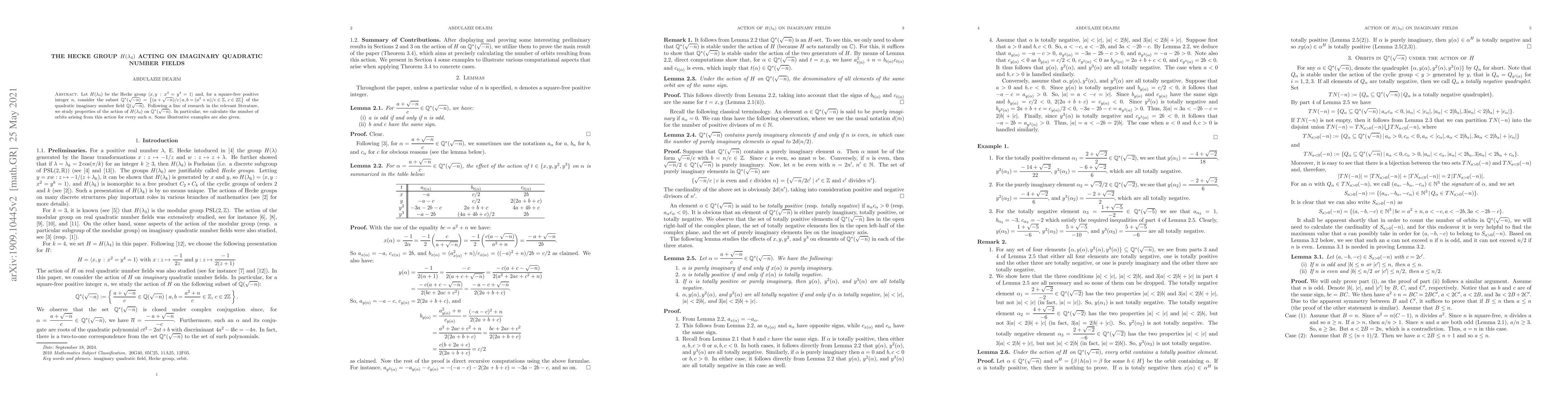 Let $H(\lambda_4)$ be the Hecke group $\langle x,y\,:\, x^2=y^4=1 \rangle$ and, for a square-free positive integer $n$, consider the subset $\mathbb{Q}^*(\sqrt{-n})=\left\{(a+\sqrt{-n})/c \, | \, a,b=(a^2+n)/c \in \mathbb{Z},\, c\in 2\mathbb{Z} \right\}$ of the quadratic imaginary number field $\mathbb{Q}(\sqrt{-n})$. Following a line of research in the relevant literature, we study properties of the action of $H(\lambda_4)$ on $\mathbb{Q}^*(\sqrt{-n})$. In particular, we calculate the number of orbits arising from this action for every such $n$. Some illustrative examples are also given.