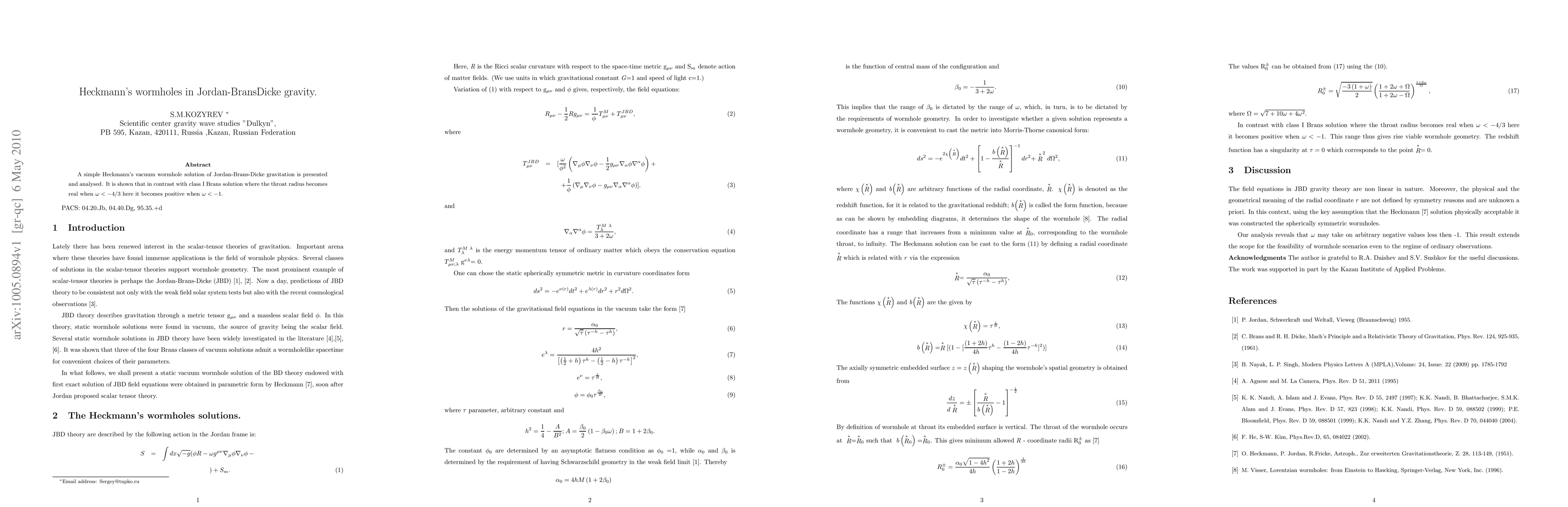 Summary: This paper presents a Heckmann's vacuum wormhole solution in the context of Jordan-Brans-Dicke gravity, demonstrating that the throat radius becomes positive when the coupling parameter $\omega < -1$, differing from the behavior in class I Brans solutions where it becomes real when $\omega < -4/3$.