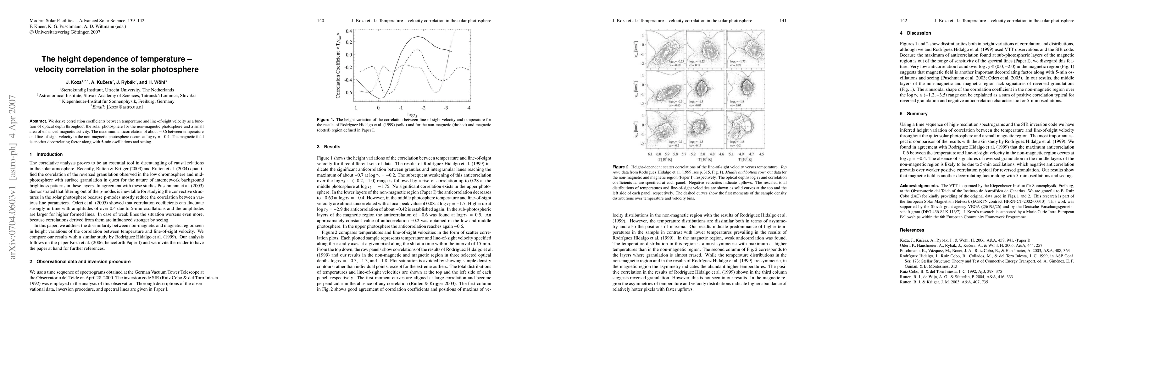 We derive correlation coefficients between temperature and line-of-sight velocity as a function of optical depth throughout the solar photosphere for the non-magnetic photosphere and a small area of enhanced magnetic activity. The maximum anticorrelation of about -0.6 between temperature and line-of-sight velocity in the non-magnetic photosphere occurs at log tau5 = -0.4. The magnetic field is another decorrelating factor along with 5-min oscillations and seeing.