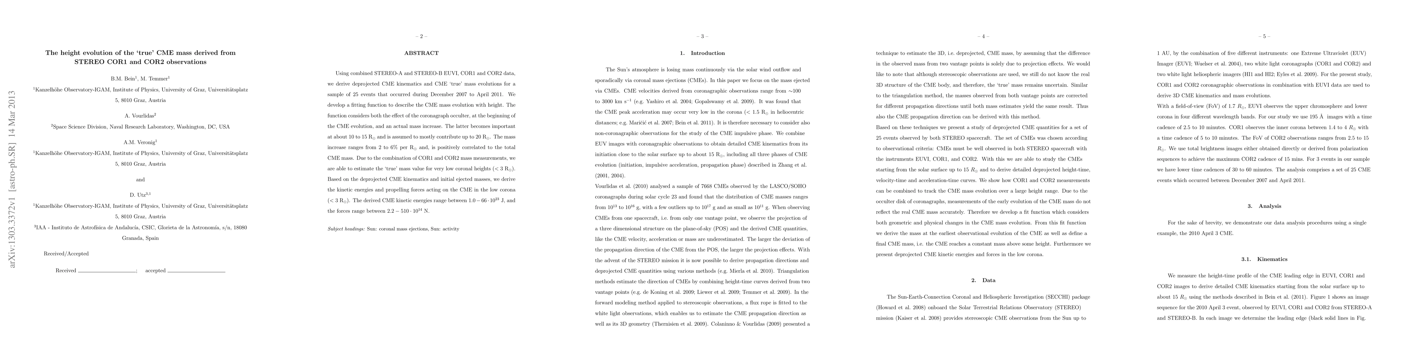 Using combined STEREO-A and STEREO-B EUVI, COR1 and COR2 data, we derive deprojected CME kinematics and CME `true' mass evolutions for a sample of 25 events that occurred during December 2007 to April 2011. We develop a fitting function to describe the CME mass evolution with height. The function considers both the effect of the coronagraph occulter, at the beginning of the CME evolution, and an actual mass increase. The latter becomes important at about 10Rs to 15Rs and is assumed to mostly contribute up to 20Rs. The mass increase ranges from 2% to 6% per Rs and, is positively correlated to the total CME mass. Due to the combination of COR1 and COR2 mass measurements, we are able to estimate the `true' mass value for very low coronal heights (< 3Rs). Based on the deprojected CME kinematics and initial ejected masses, we derive the kinetic energies and propelling forces acting on the CME in the low corona (< 3Rs). The derived CME kinetic energies range between 1-66*10^23 J, and the forces range between 2.2-510*10^14 N.