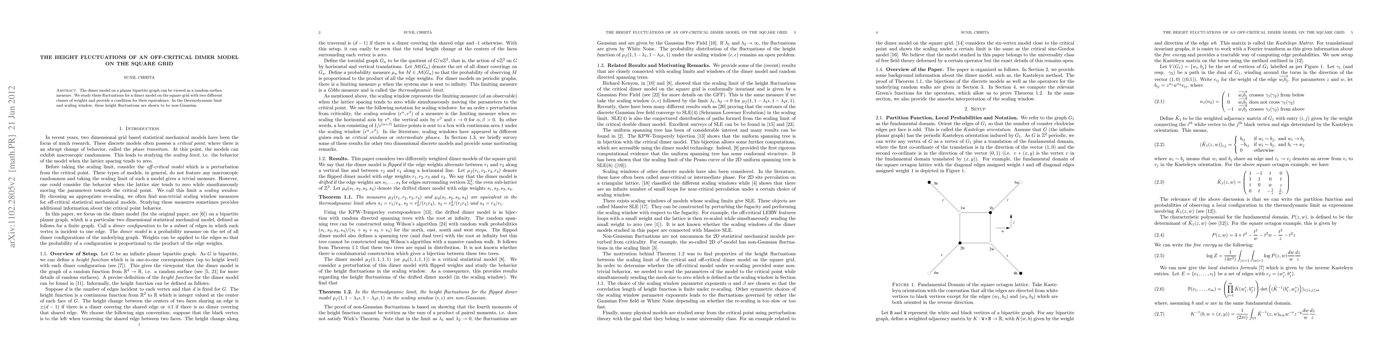 The work introduces a detailed analysis of height fluctuations in an off-critical dimer model on a square grid, distinguishing itself by providing explicit conditions for equivalence and characterizing the rotational invariance and non-Gaussian behavior of the fluctuations.