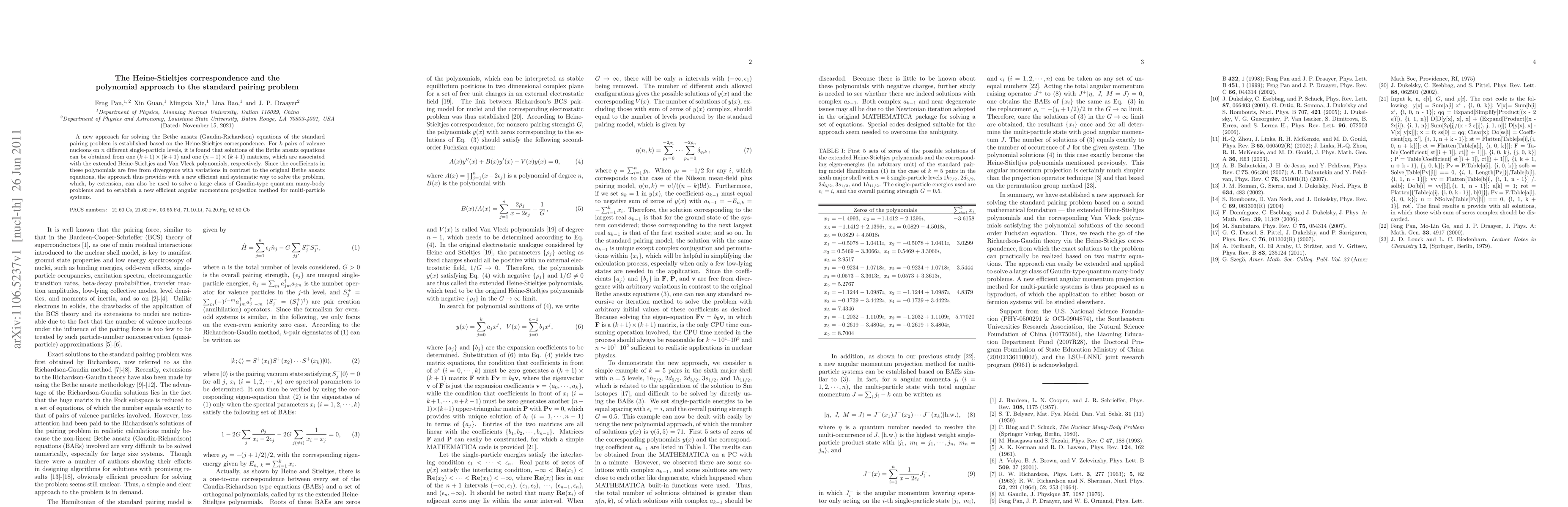 A new approach for solving the Bethe ansatz (Gaudin-Richardson) equations of the standard pairing problem is established based on the Heine-Stieltjes correspondence. For $k$ pairs of valence nucleons on $n$ different single-particle levels, it is found that solutions of the Bethe ansatz equations can be obtained from one (k+1)x(k+1) and one (n-1)x(k+1) matrices, which are associated with the extended Heine-Stieltjes and Van Vleck polynomials, respectively. Since the coefficients in these polynomials are free from divergence with variations in contrast to the original Bethe ansatz equations, the approach thus provides with a new efficient and systematic way to solve the problem, which, by extension, can also be used to solve a large class of Gaudin-type quantum many-body problems and to establish a new efficient angular momentum projection method for multi-particle systems.