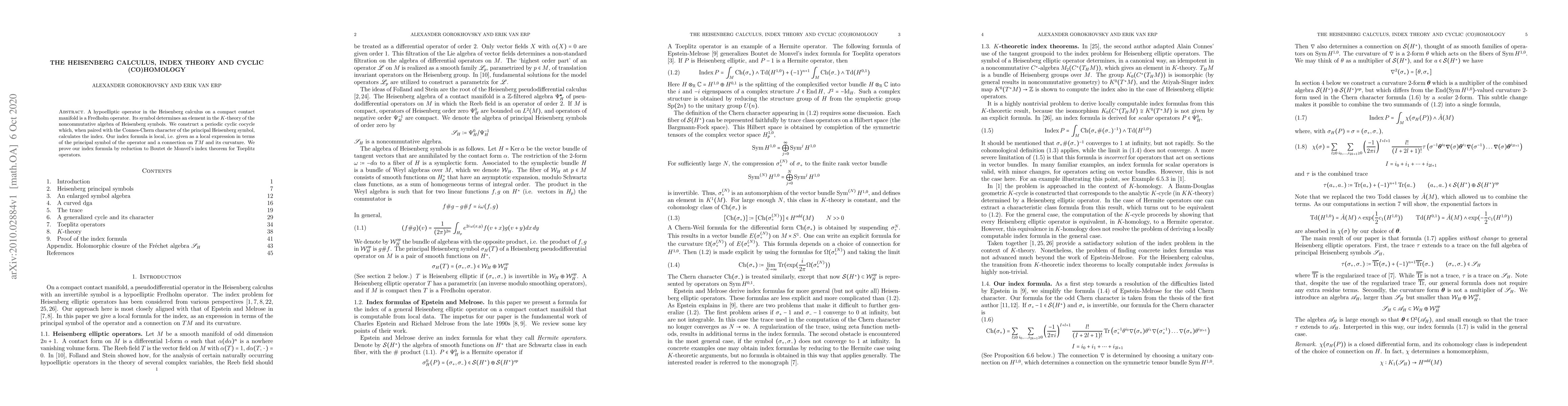 This paper constructs a periodic cyclic cocycle for hypoelliptic operators in the Heisenberg calculus on compact contact manifolds, linking it to K-theory and the Connes-Chern character. The authors derive a local index formula for these operators, proving it through reduction to Boutet de Monvel's index theorem for Toeplitz operators.