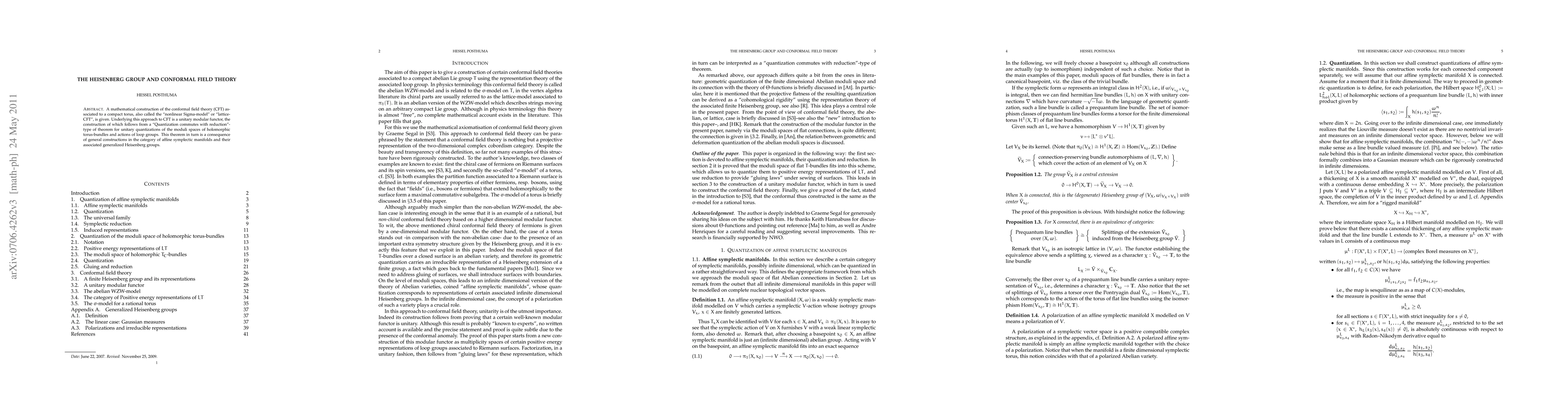 A mathematical construction of the conformal field theory (CFT) associated to a compact torus, also called the "nonlinear Sigma-model" or "lattice-CFT", is given. Underlying this approach to CFT is a unitary modular functor, the construction of which follows from a "Quantization commutes with reduction"- type of theorem for unitary quantizations of the moduli spaces of holomorphic torus-bundles and actions of loop groups. This theorem in turn is a consequence of general constructions in the category of affine symplectic manifolds and their associated generalized Heisenberg groups.
