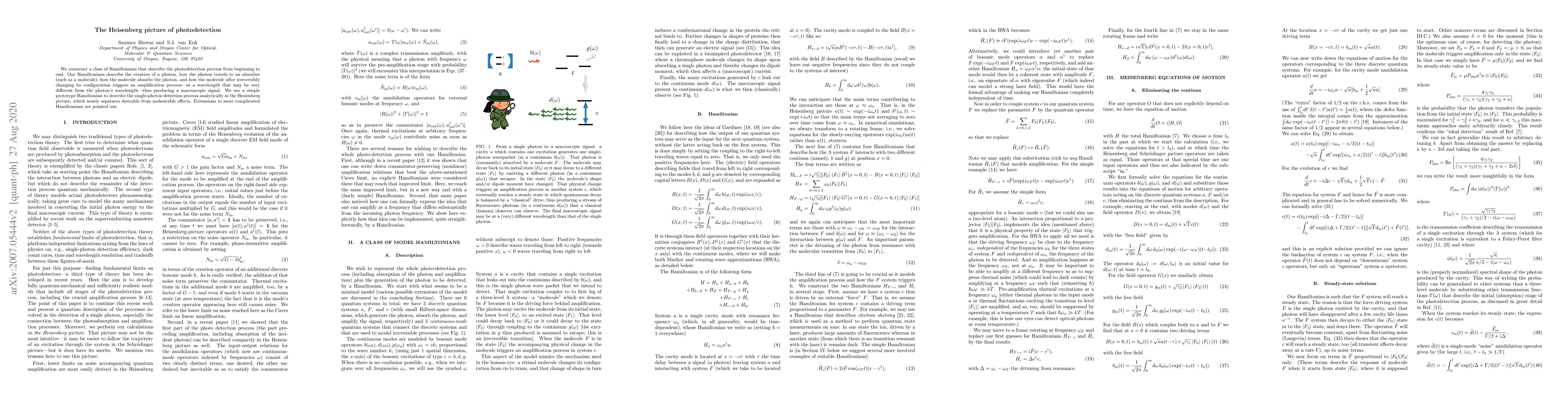 We construct a class of Hamiltonians that describe the photodetection process from beginning to end. Our Hamiltonians describe the creation of a photon, how the photon travels to an absorber (such as a molecule), how the molecule absorbs the photon, and how the molecule after irreversibly changing its configuration triggers an amplification process---at a wavelength that may be very different from the photon's wavelength---thus producing a macroscopic signal. We use a simple prototype Hamiltonian to describe the single-photon detection process analytically in the Heisenberg picture, which neatly separates desirable from undesirable effects. Extensions to more complicated Hamiltonians are pointed out.