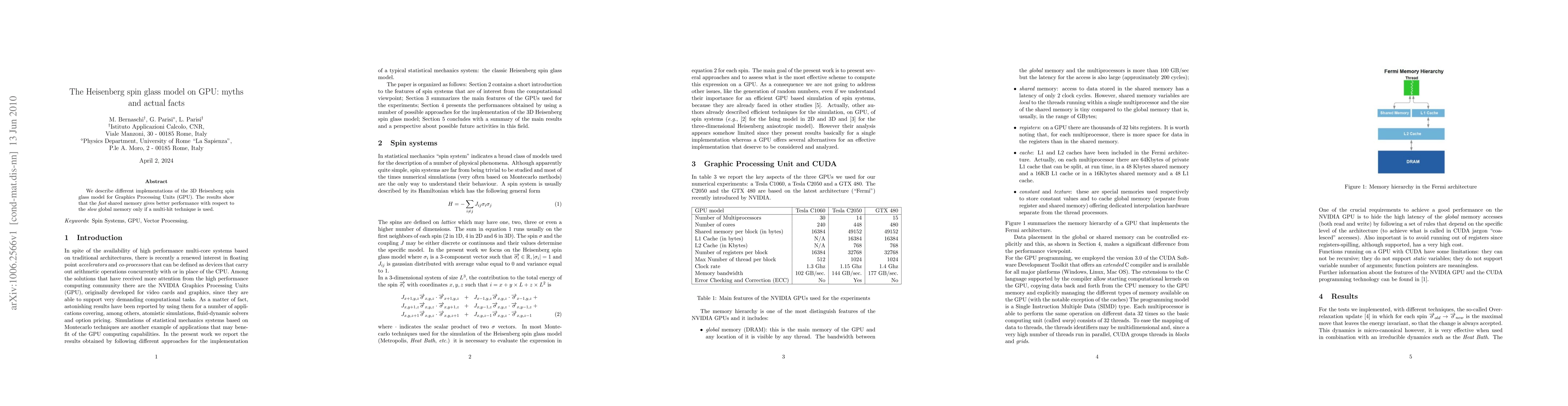 We describe different implementations of the 3D Heisenberg spin glass model for Graphics Processing Units (GPU). The results show that the {\em fast} shared memory gives better performance with respect to the {\em slow} global memory only if a multi-hit technique is used.