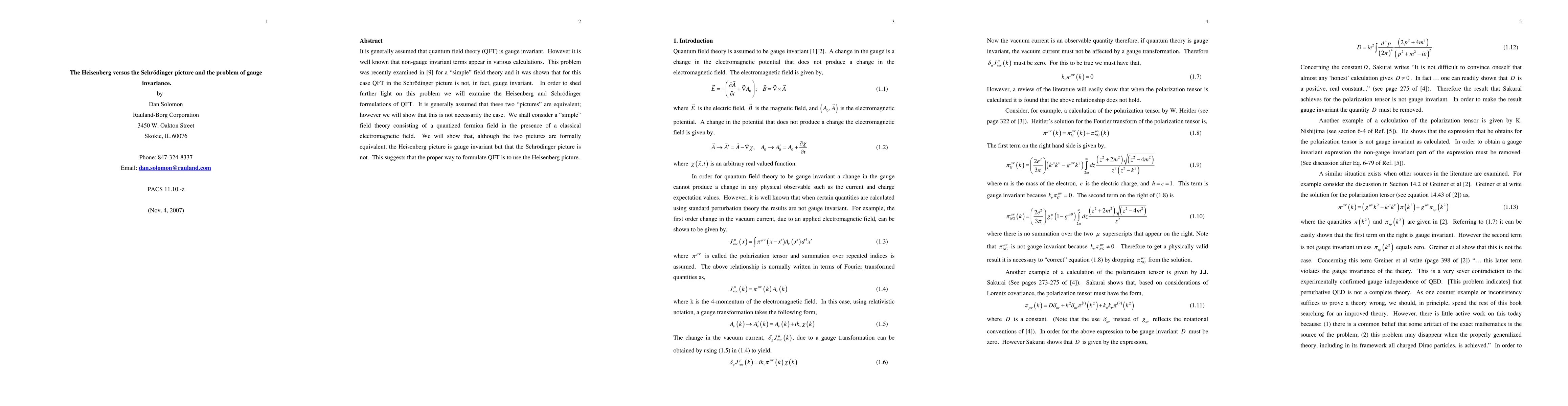 It is generally assumed that quantum field theory (QFT) is gauge invariant. However it is well known that non-gauge invariant terms appear in various calculations. This problem was recently examined in [9] for a "simple" field theory and it was shown that for this case QFT in the Schroedinger picture is not, in fact, gauge invariant. In order to shed further light on this problem we will examine the Heisenberg and Schroedinger formulations of QFT. It is generally assumed that these two "pictures" are equivalent; however we will show that this is not necessarily the case. We shall consider a simple field theory consisting of a quantized fermion field in the presence of a classical electromagnetic field. We will show that, although the two pictures are formally equivalent, the Heisenberg picture is gauge invariant but that the Schroedinger picture is not. This suggests that the proper way to formulate QFT is to use the Heisenberg picture.