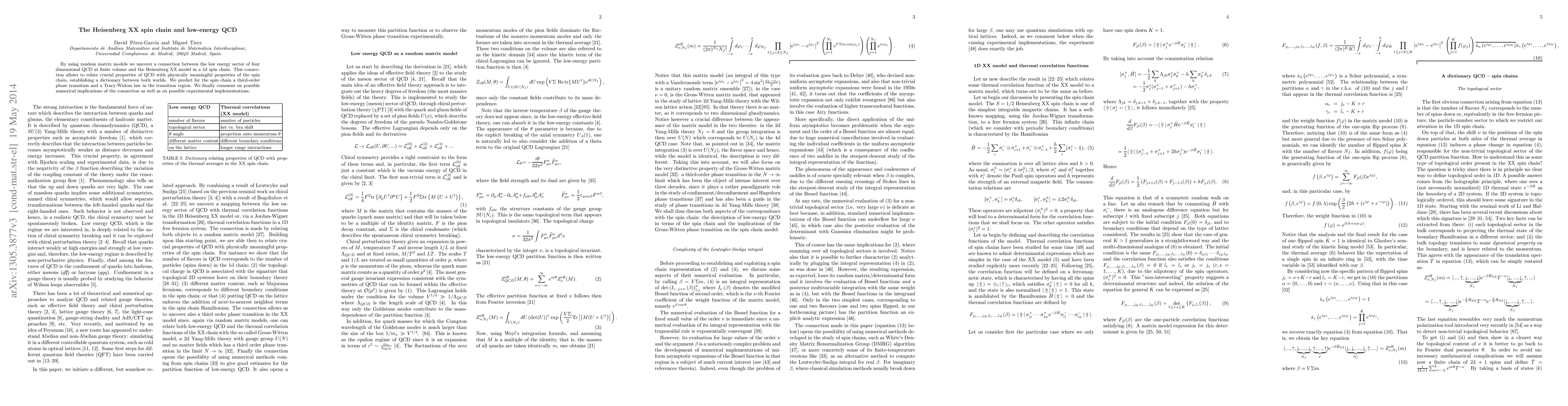 By using random matrix models we uncover a connection between the low energy sector of four dimensional QCD at finite volume and the Heisenberg XX model in a 1d spin chain. This connection allows to relate crucial properties of QCD with physically meaningful properties of the spin chain, establishing a dictionary between both worlds. We predict for the spin chain a third-order phase transition and a Tracy-Widom law in the transition region. We postulate that this dictionary goes beyond the particular example analyzed here and can be applied to other QFT and spin chain models. We finally comment on possible numerical implications of the connection as well as on possible experimental implementations.