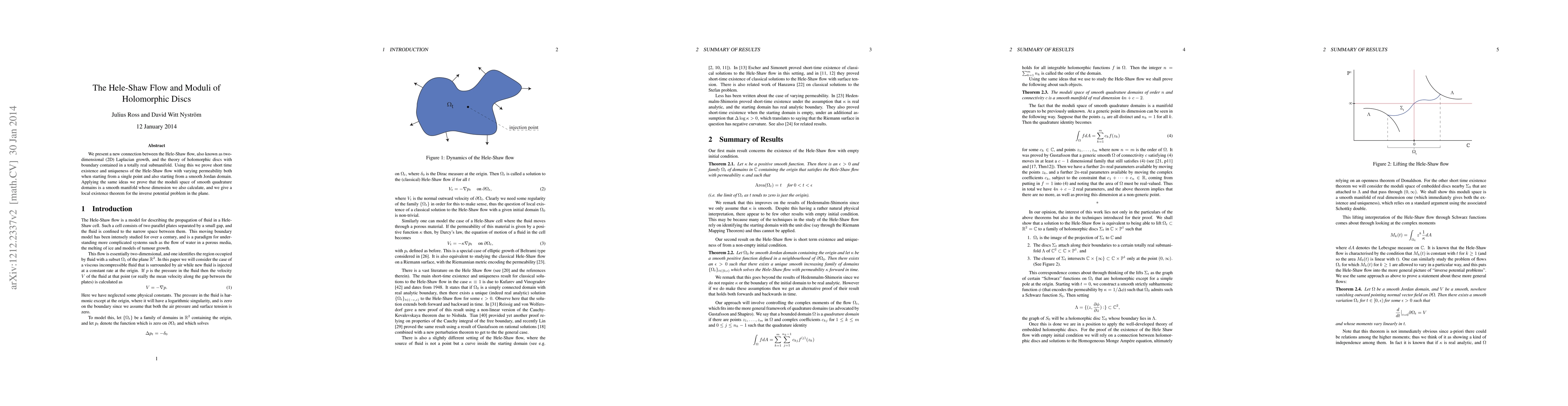 We present a new connection between the Hele-Shaw flow, also known as two-dimensional (2D) Laplacian growth, and the theory of holomorphic discs with boundary contained in a totally real submanifold. Using this we prove short time existence and uniqueness of the Hele-Shaw flow with varying permeability both when starting from a single point and also starting from a smooth Jordan domain. Applying the same ideas we prove that the moduli space of smooth quadrature domains is a smooth manifold whose dimension we also calculate, and we give a local existence theorem for the inverse potential problem in the plane.