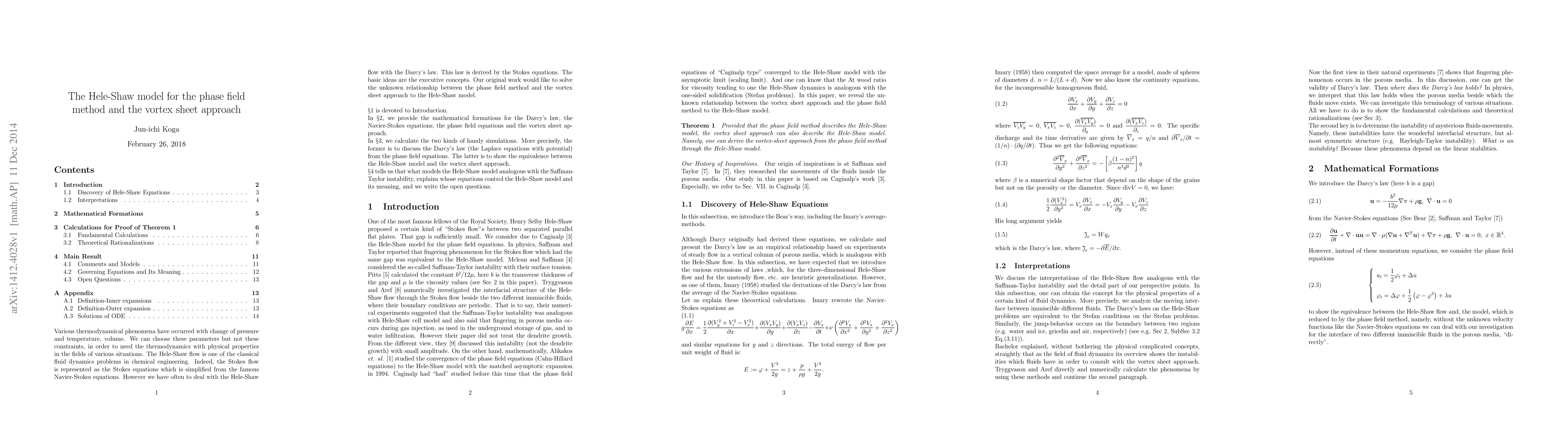 Various thermodynamical phenomena have occurred with change of pressure and temperature, volume. We can choose these parameters but not these constraints, in order to need the thermodynamics with physical properties in the fields of various situations. The Hele-Shaw flow is one of the classical fluid dynamics problems in chemical engineering. Indeed, the Stokes flow is represented as the Stokes equations which is simplified from the famous Navier-Stokes equations. However we have often to deal with the Hele-Shaw flow with the Darcy's law. This law is derived by the Stokes equations. The basic ideas are the executive concepts. Our original work would like to solve the unknown relationship between the phase field method and the vortex sheet approach to the Hele-Shaw model.