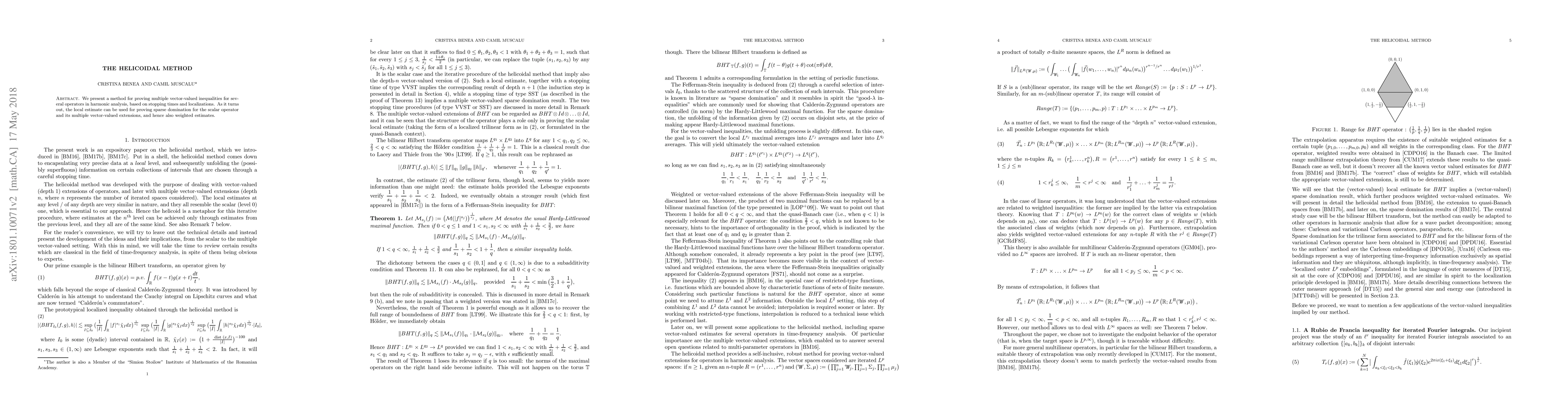 Summary: The helicoidal method is introduced as a tool for proving vector-valued inequalities in harmonic analysis, leveraging stopping times and localizations. It also enables sparse domination and weighted estimates for both scalar and vector-valued operators.