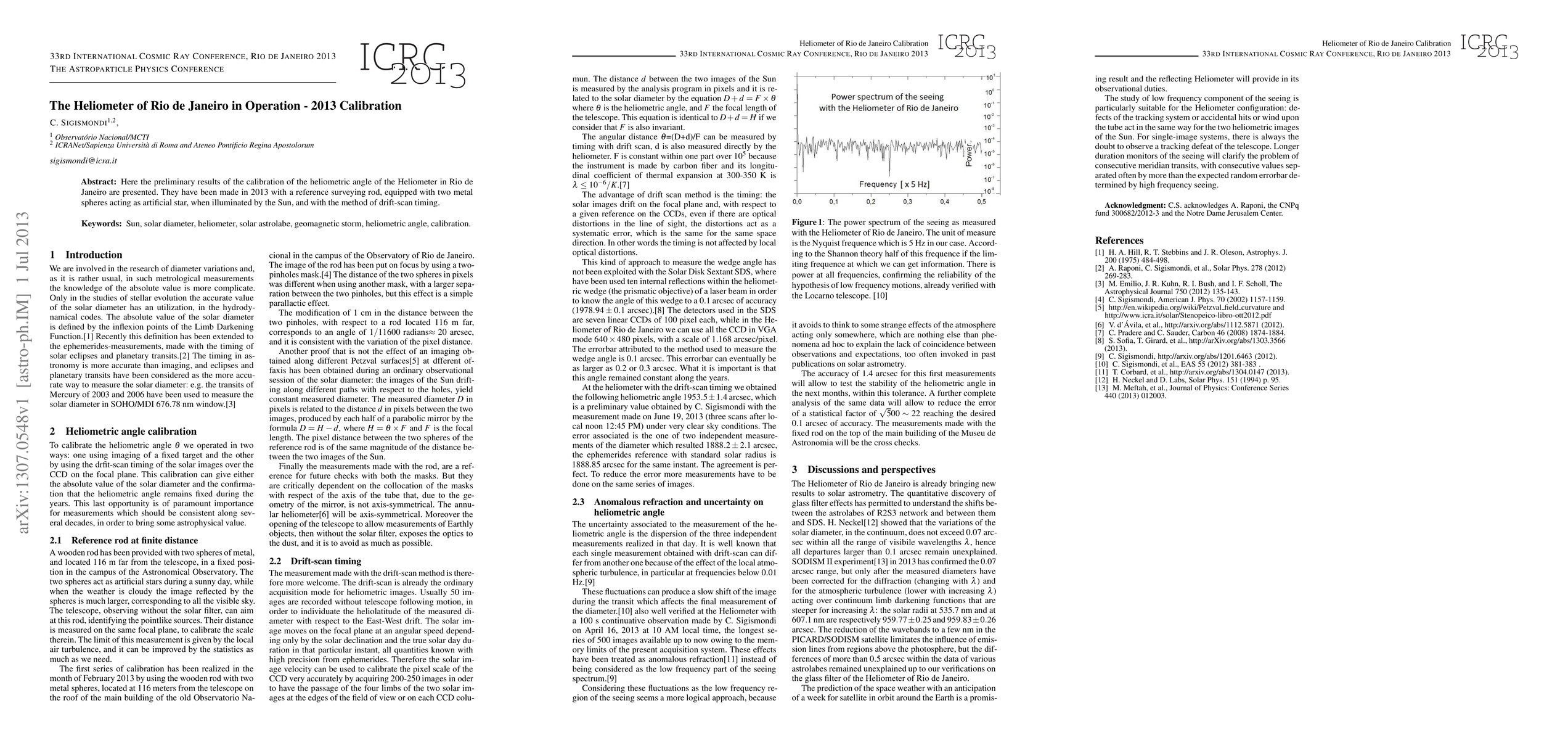 Here the preliminary results of the calibration of the heliometric angle of the Heliometer in Rio de Janeiro are presented. They have been made in 2013 with a reference surveying rod, equipped with two metal spheres acting as artificial star, when illuminated by the Sun, and with the method of drift-scan timing.