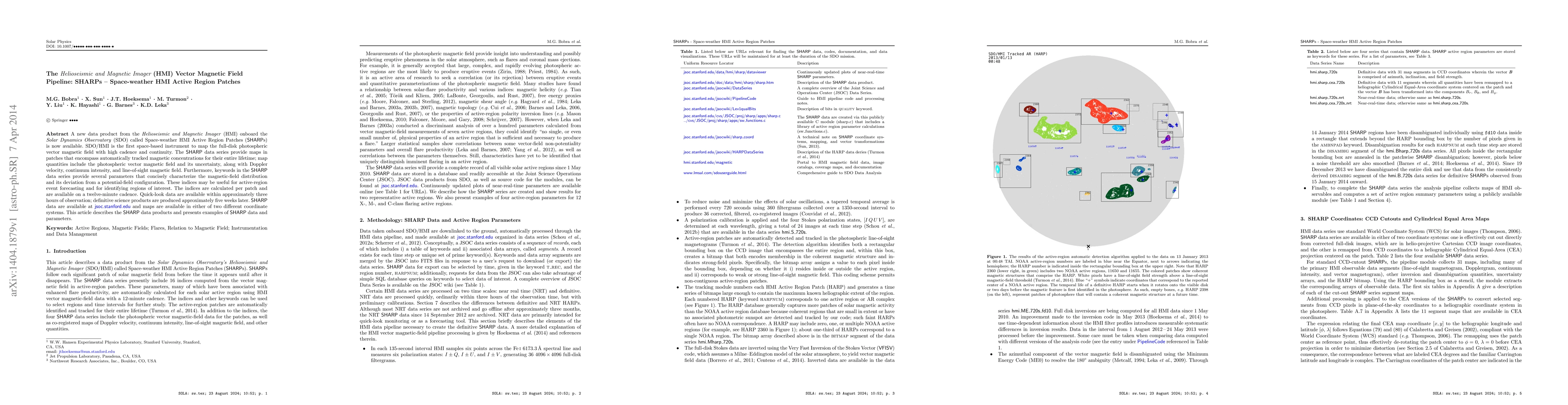The SHARPs pipeline from the HMI instrument on the SDO provides high-cadence maps of active regions' vector magnetic fields, including uncertainties, Doppler velocities, and other parameters, useful for space-weather forecasting and region identification. These data are available in near real-time and definitive products are released after five weeks.