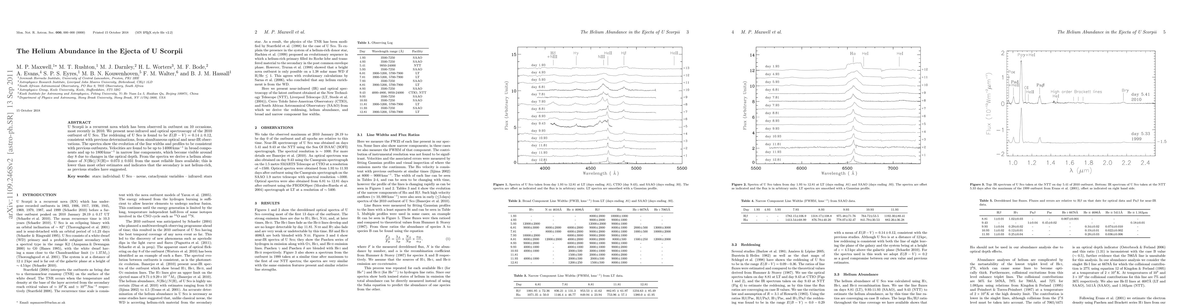 U Scorpii is a recurrent nova which has been observed in outburst on 10 occasions, most recently in 2010. We present near-infrared and optical spectroscopy of the 2010 outburst of U Sco. The reddening of U Sco is found to be $E(B-V) = 0.14\pm0.12$, consistent with previous determinations, from simultaneous optical and near-IR observations. The spectra show the evolution of the line widths and profiles to be consistent with previous outbursts. Velocities are found to be up to 14000\,kms$^{-1}$ in broad components and up to 1800\,kms$^{-1}$ in narrow line components, which become visible around day 8 due to changes in the optical depth. From the spectra we derive a helium abundance of $N$(He)/$N$(H)$ = 0.073\pm0.031$ from the most reliable lines available; this is lower than most other estimates and indicates that the secondary is not helium-rich, as previous studies have suggested.