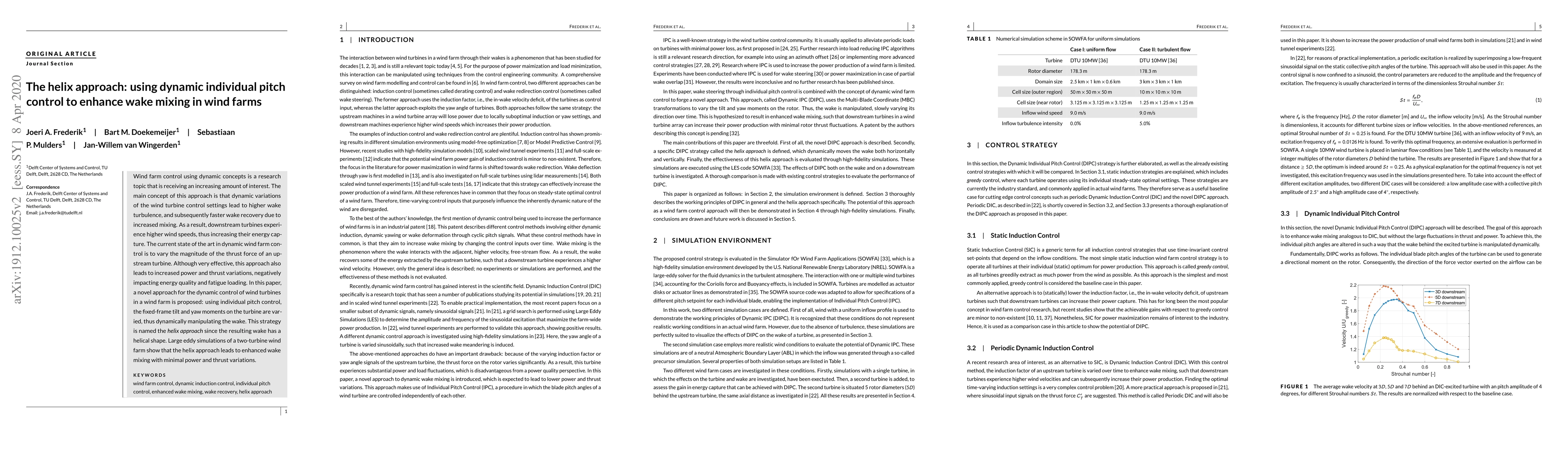 This paper proposes a novel dynamic control method called the helix approach for wind farms, which uses individual pitch control to enhance wake mixing and increase downstream turbine energy capture with minimal power and thrust variations. Large eddy simulations demonstrate its effectiveness compared to traditional methods.