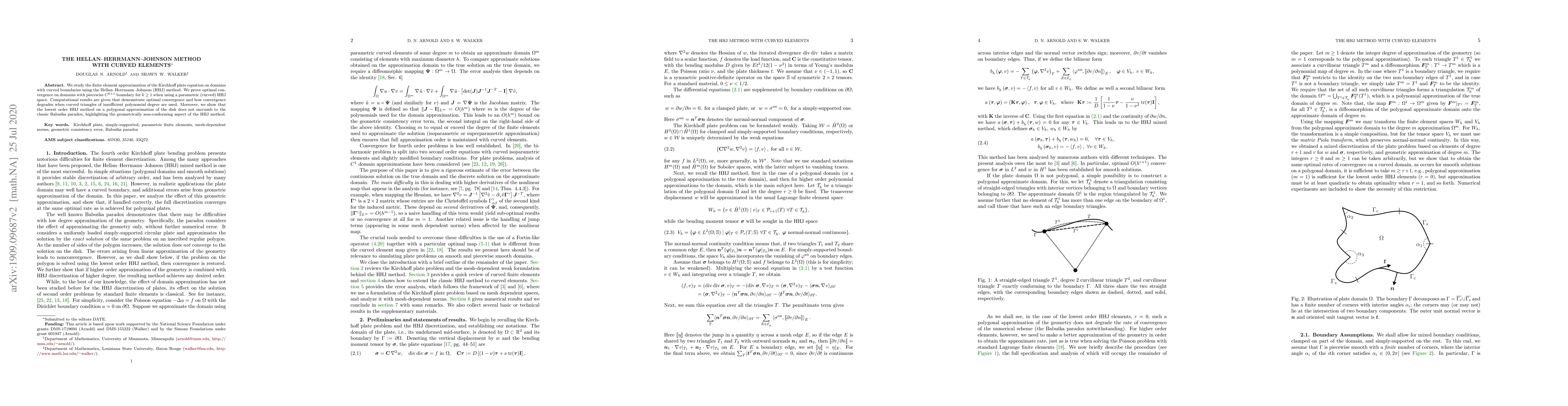 We study the finite element approximation of the Kirchhoff plate equation on domains with curved boundaries using the Hellan-Herrmann-Johnson (HHJ) method. We prove optimal convergence on domains with piecewise $C^{k+1}$ boundary for $k \geq 1$ when using a parametric (curved) HHJ space. Computational results are given that demonstrate optimal convergence and how convergence degrades when curved triangles of insufficient polynomial degree are used. Moreover, we show that the lowest order HHJ method on a polygonal approximation of the disk does not succumb to the classic Babu\v{s}ka paradox, highlighting the geometrically non-conforming aspect of the HHJ method.
