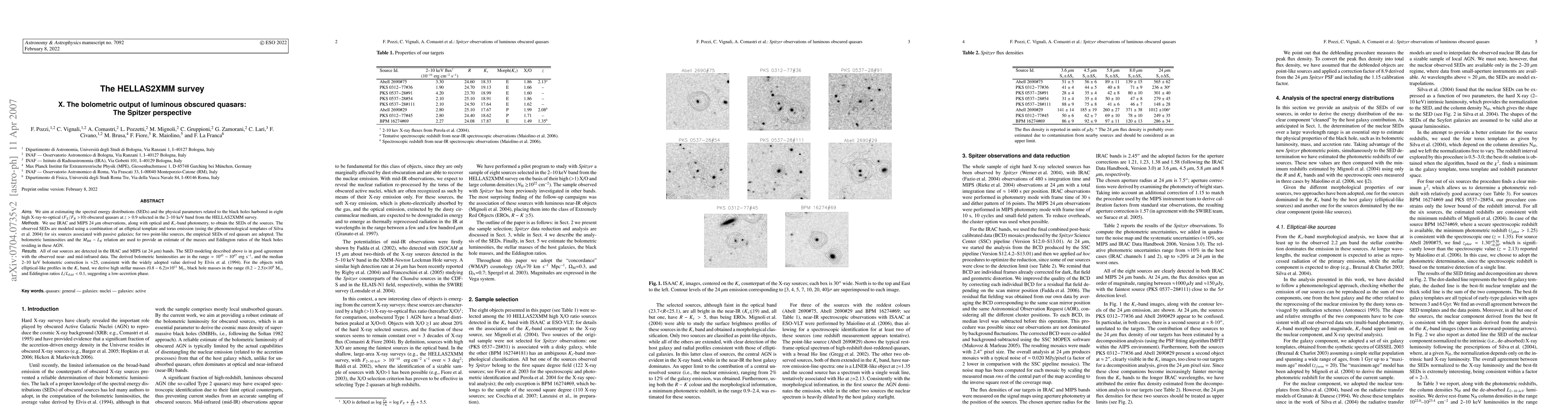 Aims: We aim at estimating the spectral energy distributions (SEDs) and the physical parameters related to the black holes harbored in eight high X-ray-to-optical (F_X/F_R>10) obscured quasars at z>0.9 selected in the 2--10 keV band from the HELLAS2XMM survey. Methods: We use IRAC and MIPS 24 micron observations, along with optical and Ks-band photometry, to obtain the SEDs of the sources. The observed SEDs are modeled using a combination of an elliptical template and torus emission (using the phenomenological templates of Silva et al. 2004) for six sources associated with passive galaxies; for two point-like sources, the empirical SEDs of red quasars are adopted. The bolometric luminosities and the M_BH-L_K relation are used to provide an estimate of the masses and Eddington ratios of the black holes residing in these AGN. Results: All of our sources are detected in the IRAC and MIPS (at 24 micron) bands. The SED modeling described above is in good agreement with the observed near- and mid-infrared data. The derived bolometric luminosities are in the range ~10^45-10^47 erg s^-1, and the median 2--10 keV bolometric correction is ~25, consistent with the widely adopted value derived by Elvis et al. (1994). For the objects with elliptical-like profiles in the K_s band, we derive high stellar masses (0.8-6.2)X10^11 Mo, black hole masses in the range (0.2-2.5)X10^9 Mo, and Eddington ratios L/L_Edd<0.1, suggesting a low-accretion phase.