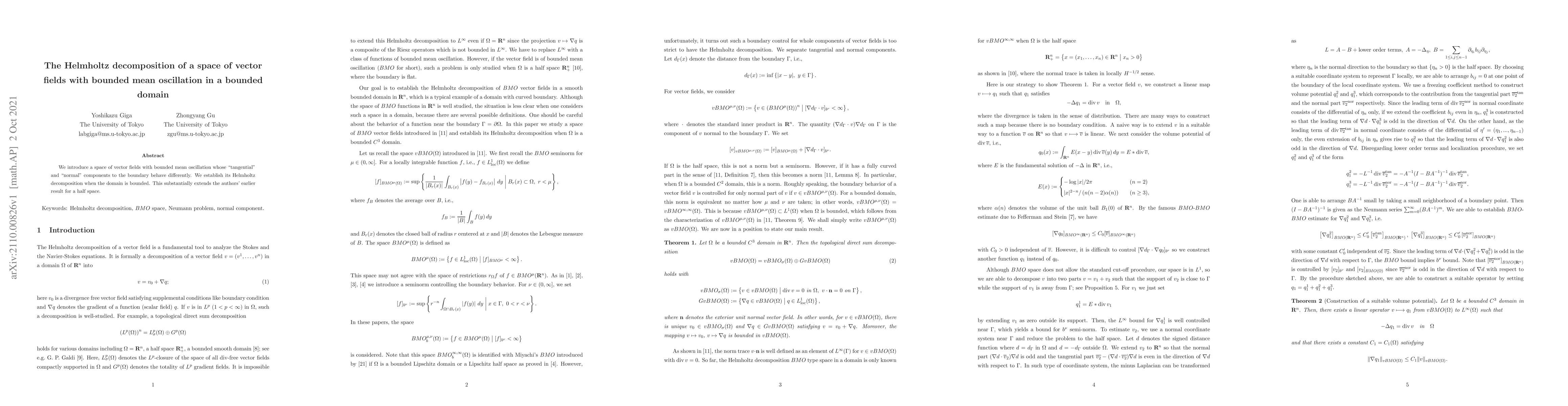 Summary: This paper introduces a novel space of vector fields with bounded mean oscillation, distinguishing between tangential and normal boundary behaviors, and establishes its Helmholtz decomposition for bounded domains, extending previous results for half spaces.