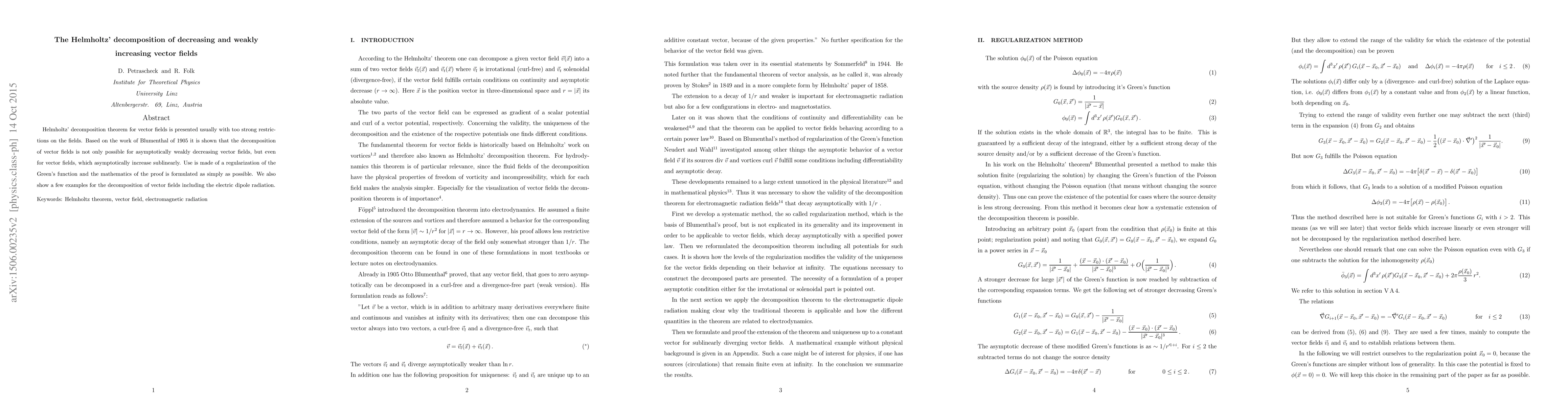 This paper presents a generalization of the Helmholtz decomposition theorem, showing it applies to vector fields that weakly increase or decrease asymptotically, using Blumenthal's 1905 work, regularization of the Green's function, and providing examples like electric dipole radiation.