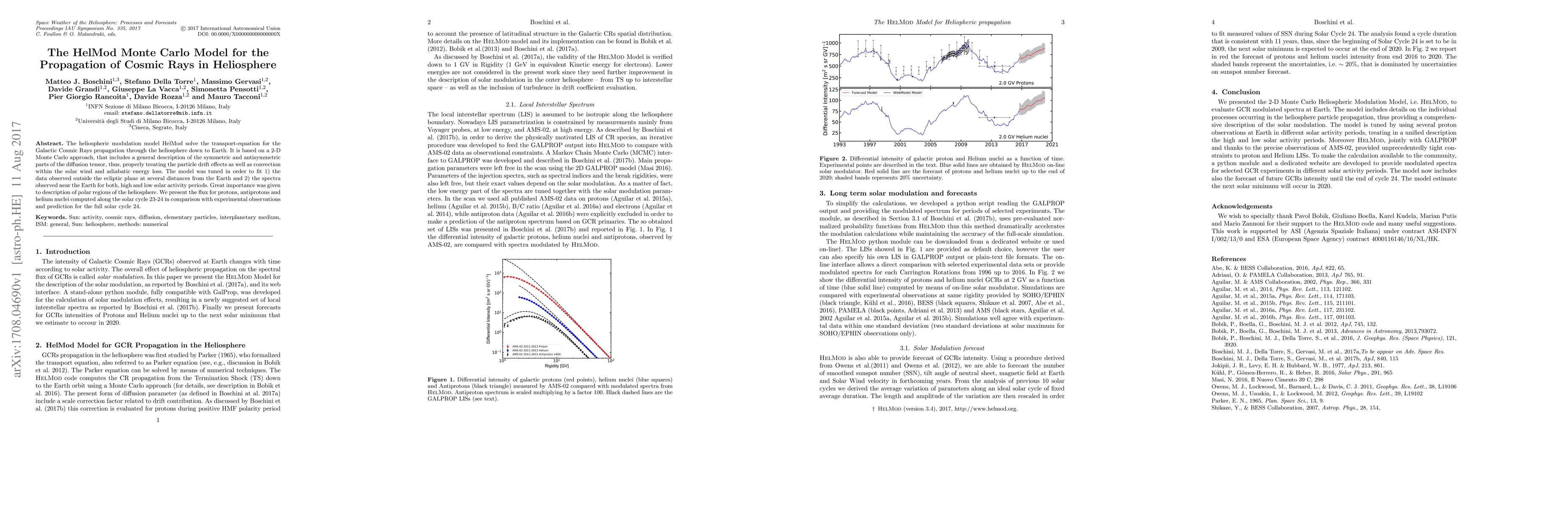 The HelMod Monte Carlo model accurately simulates Galactic Cosmic Rays' propagation through the heliosphere using a 2-D Monte Carlo approach, fitting observed data from various solar activity periods and emphasizing polar regions. The model predicts proton, antiproton, and helium nuclei fluxes over solar cycle 23-24, compared with experimental observations.