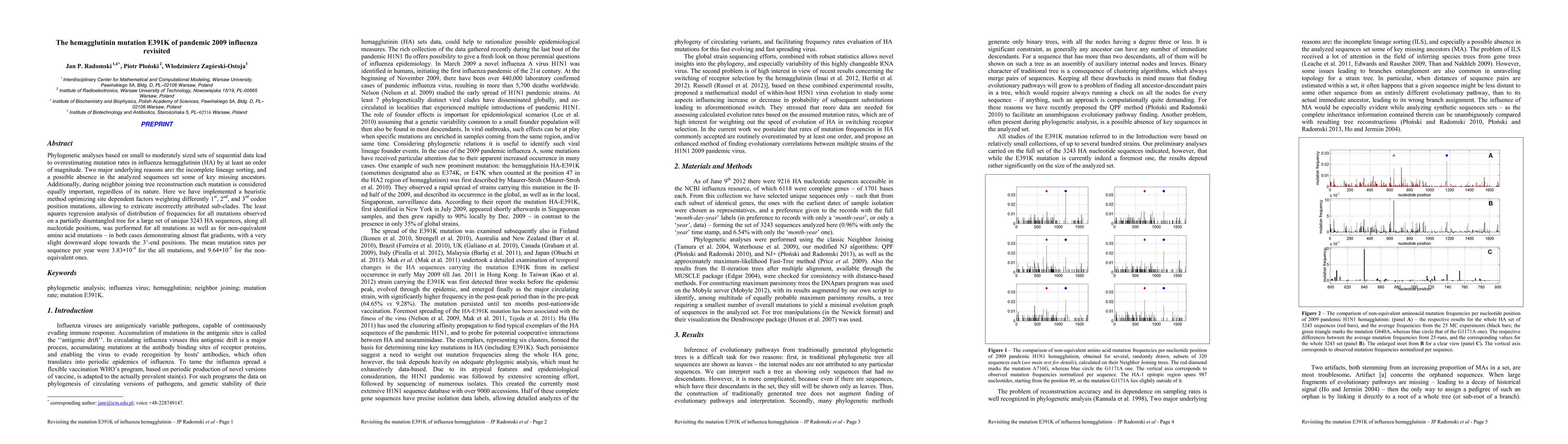 This study corrects overestimated mutation rates in influenza HA by addressing incomplete lineage sorting and missing ancestors in phylogenetic analyses. Using a heuristic method, they found mean mutation rates of 3.83*10^-4 for all mutations and 9.64*10^-5 for non-equivalent amino acid mutations per sequence per year.
