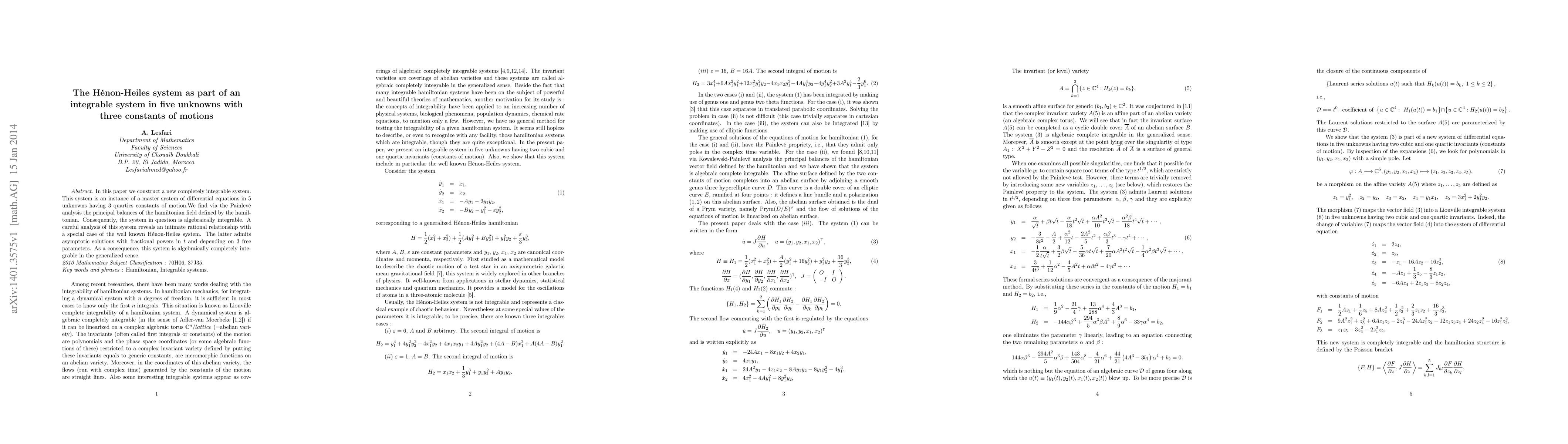 In this paper we construct a new completely integrable system. This system is an instance of a master system of differential equations in $5$ unknowns having $3$ quartics constants of motion.We find via the Painlev\'e analysis the principal balances of the hamiltonian field defined by the hamiltonian. Consequently, the system in question is algebraically integrable. A careful analysis of this system reveals an intimate rational relationship with a special case of the well known H\'{e}non-Heiles system. The latter admits asymptotic solutions with fractional powers in $t$ and depending on $3$ free parameters. As a consequence, this system is algebraically completely integrable in the generalized sense.