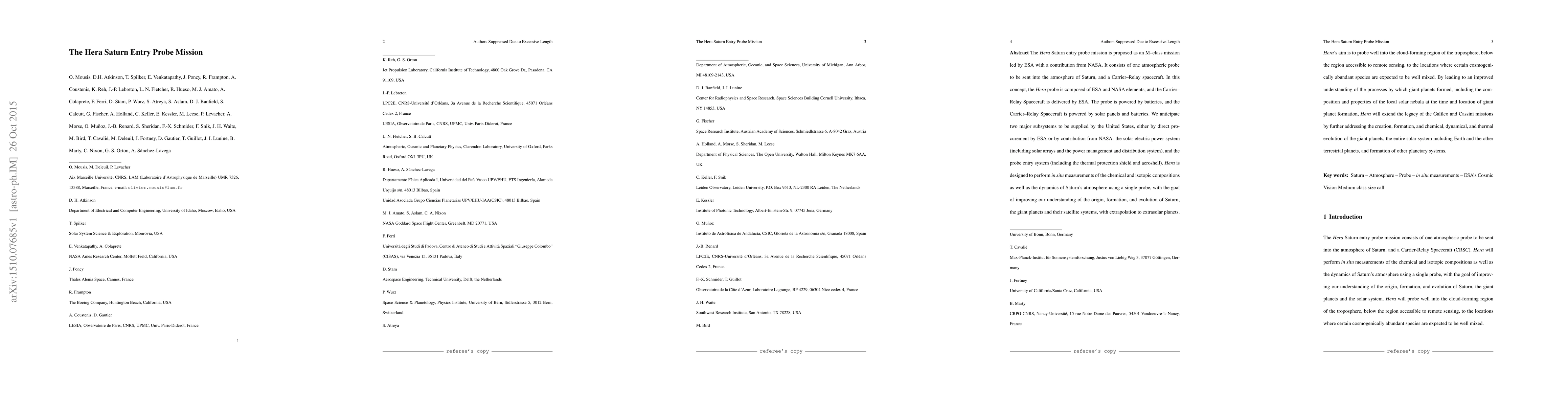The Hera Saturn entry probe mission aims to study Saturn's atmosphere directly to better understand the planet's origin and evolution, building on previous missions like Galileo and Cassini. It involves an atmospheric probe and relay spacecraft, with international collaboration, to explore the chemical and dynamical properties of Saturn and insights into planetary formation.