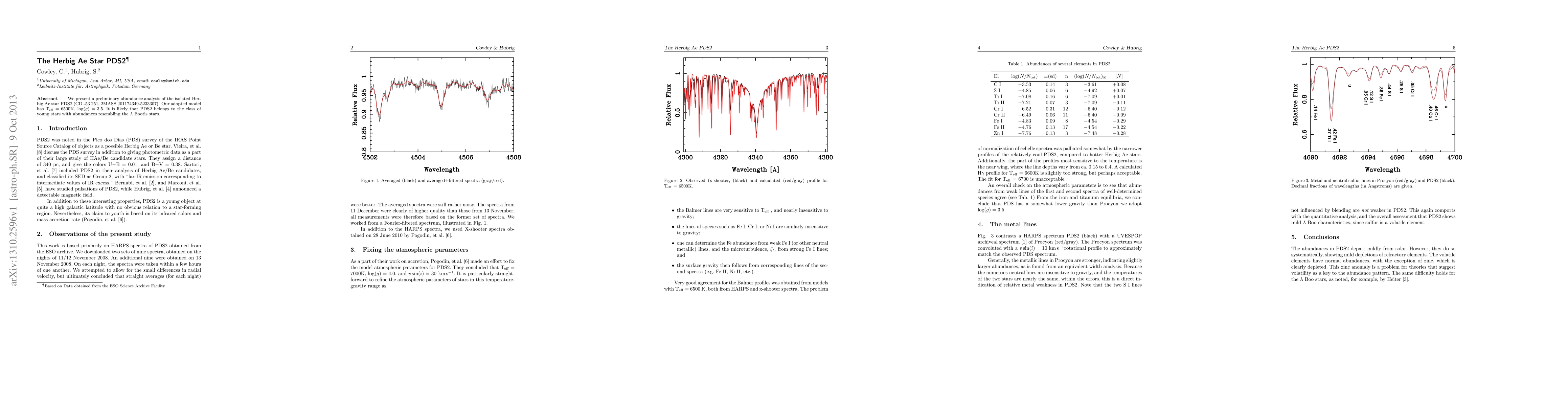 We present a preliminary abundance analysis of the isolated Herbig Ae star PDS2 (CD -53 251, 2MASS J01174349-5233307). Our adopted model has Teff = 6500K, log(g) = 3.5. It is likely that PDS2 belongs to the class of young stars with abundances resembling the Lambda Bootis stars.