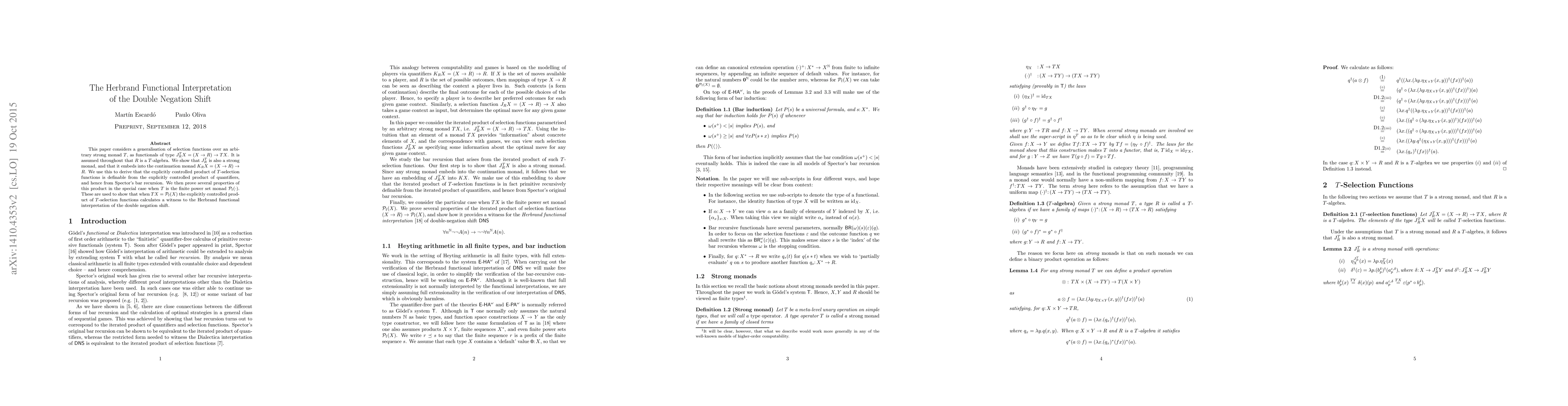 This paper generalizes selection functions over a strong monad $T$ into functionals of type $J^T_R X$, showing that $J^T_R$ is also a strong monad and embeds into the continuation monad $K_R X$. It demonstrates that the explicitly controlled product of $T$-selection functions can be derived from Spector's bar recursion, ultimately proving that for the finite power set monad $T$, it provides a witness to the Herbrand functional interpretation of the double negation shift.