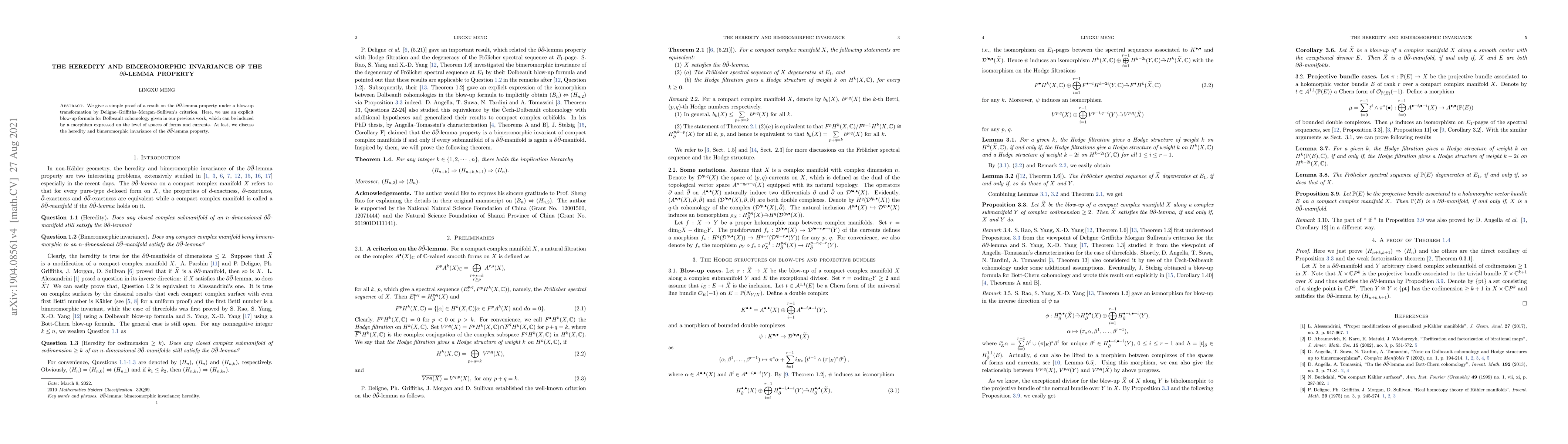 This paper provides a straightforward proof of the $\partial\bar{\partial}$-lemma property under blow-up transformations using Dolbeault cohomology, highlighting its heredity and invariance under bimeromorphic transformations according to Deligne-Griffiths-Morgan-Sullivan's criterion.