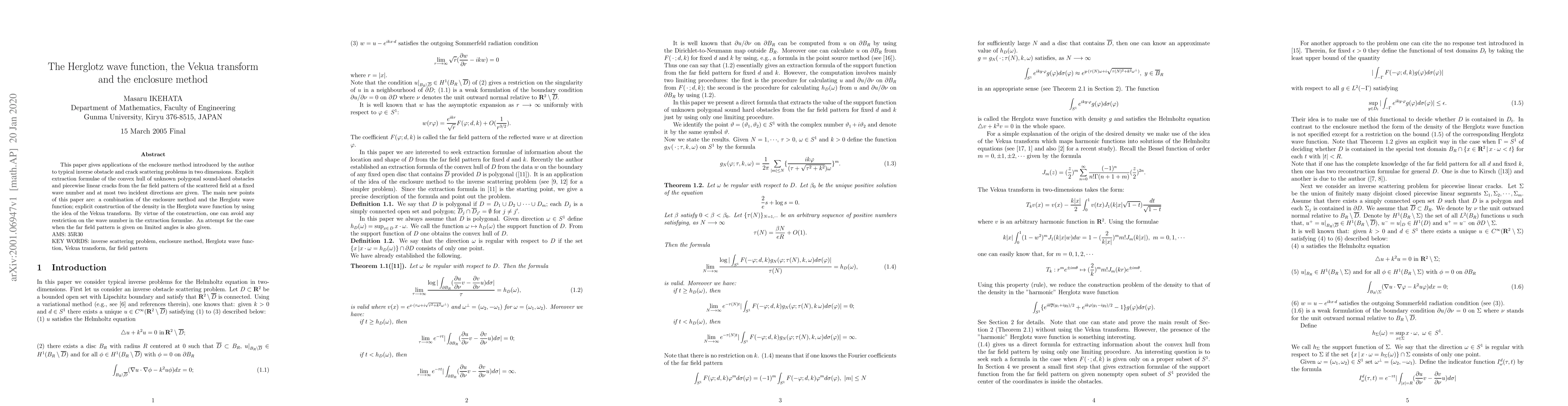This paper gives applications of the enclosure method introduced by the author to typical inverse obstacle and crack scattering problems in two dimensions. Explicit extraction formulae of the convex hull of unknown polygonal sound-hard obstacles and piecewise linear cracks from the far field pattern of the scattered field at a fixed wave number and at most two incident directions are given. The main new points of this paper are: a combination of the enclosure method and the Herglotz wave function; explicit construction of the density in the Herglotz wave function by using the idea of the Vekua transform. By virtue of the construction, one can avoid any restriction on the wave number in the extraction formulae. An attempt for the case when the far field pattern is given on limited angles is also given.