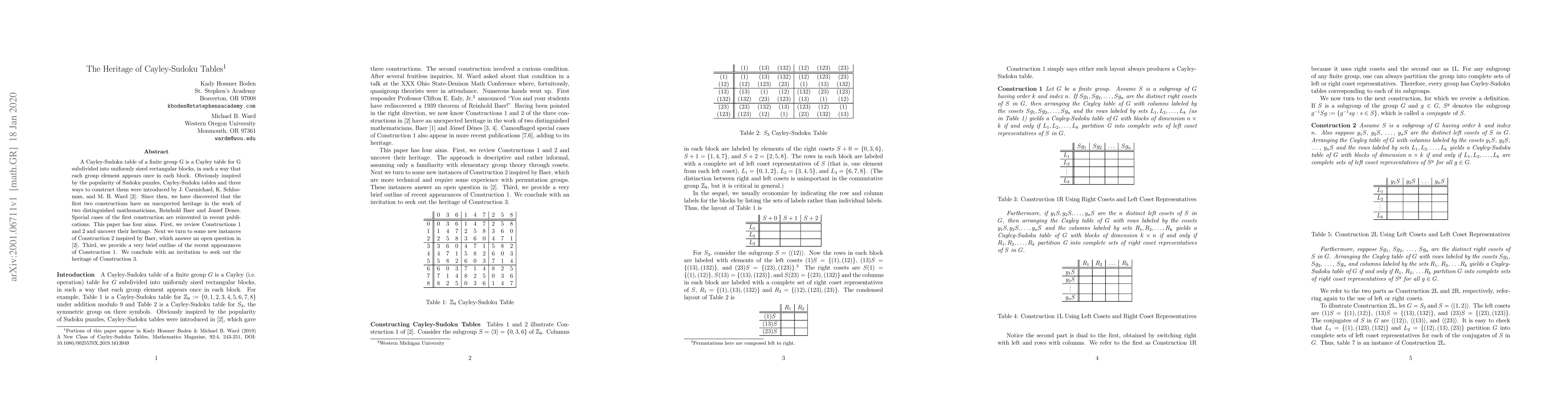 A Cayley-Sudoku table of a finite group G is a Cayley table for G subdivided into uniformly sized rectangular blocks, in such a way that each group element appears once in each block. They were introduced by J. Carmichael, K. Schloeman, and M. B. Ward [CSW], who also gave three ways to construct them. This paper has four aims. First, we review Constructions 1 and 2 of [CSW] and uncover their unexpected heritage in the work of R. Baer and J. Denes. Next we turn to some new instances of Construction 2 inspired by Baer, which answer an open question in [CSW]. Third, we provide a very brief outline of recent reinventions of special cases of Construction 1 in the literature. We conclude with an invitation to seek out the heritage of Construction 3. Portions of this paper appear in: Kady Hossner Boden and Michael B. Ward (2019) A New Class of Cayley-Sudoku Tables, Mathematics Magazine, 92:4, 243-251, DOI: 10.1080/0025570X.2019.1613949