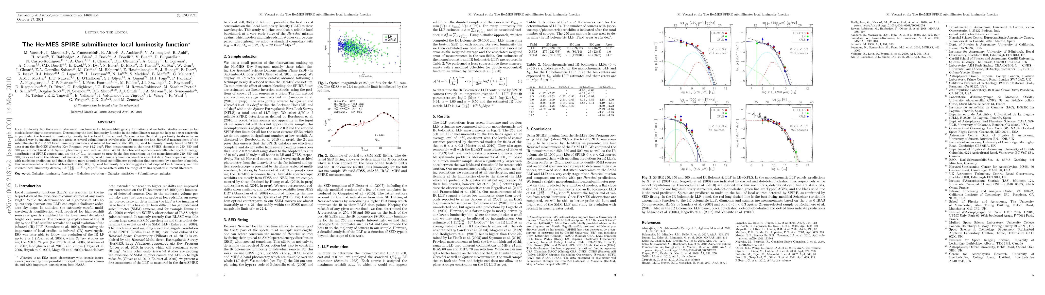 This paper presents the first local luminosity function in the submillimeter range (0<z<0.2) derived from Herschel SPIRE data, revealing a slightly more abundant submillimeter galaxy population than predicted by models. The study also measures the infrared bolometric luminosity density, consistent with recent literature, providing crucial data for high-redshift galaxy formation studies.