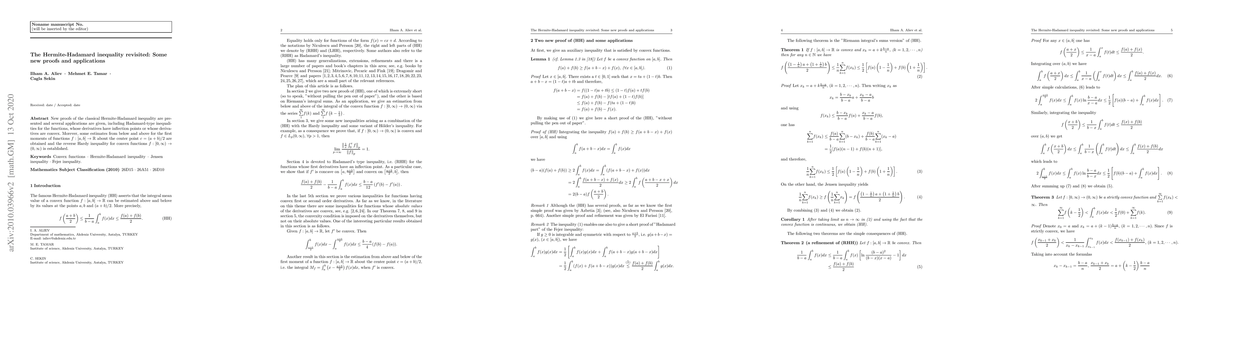 New proofs of the classical Hermite-Hadamard inequality are presented and several applications are given, including Hadamard-type inequalities for the functions, whose derivatives have inflection points or whose derivatives are convex. Morever, some estimates from below and above for the first moments of functions $% f:[a,b]\rightarrow %TCIMACRO{\U{211d} }% %BeginExpansion \mathbb{R} %EndExpansion $ about the center point $c=(a+b)/2$ are obtained and the reverse Hardy inequality for convex functions $f:[0,\infty )\rightarrow (0,\infty )$ is established.