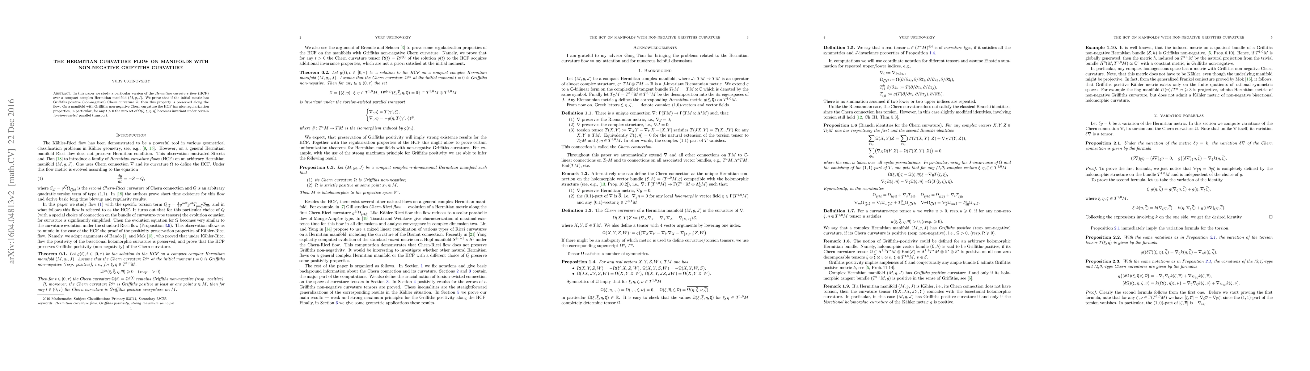 In this paper we study a particular version of the Hermitian curvature flow (HCF) over a compact complex Hermitian manifold $(M,g,J)$. We prove that if the initial metric has Griffiths positive (non-negative) Chern curvature $\Omega$, then this property is preserved along the flow. On a manifold with Griffiths non-negative Chern curvature the HCF has nice regularization properties, in particular, for any $t>0$ the zero set of $\Omega(\xi,\bar\xi,\eta,\bar\eta)$ becomes invariant under certain torsion-twisted parallel transport.
