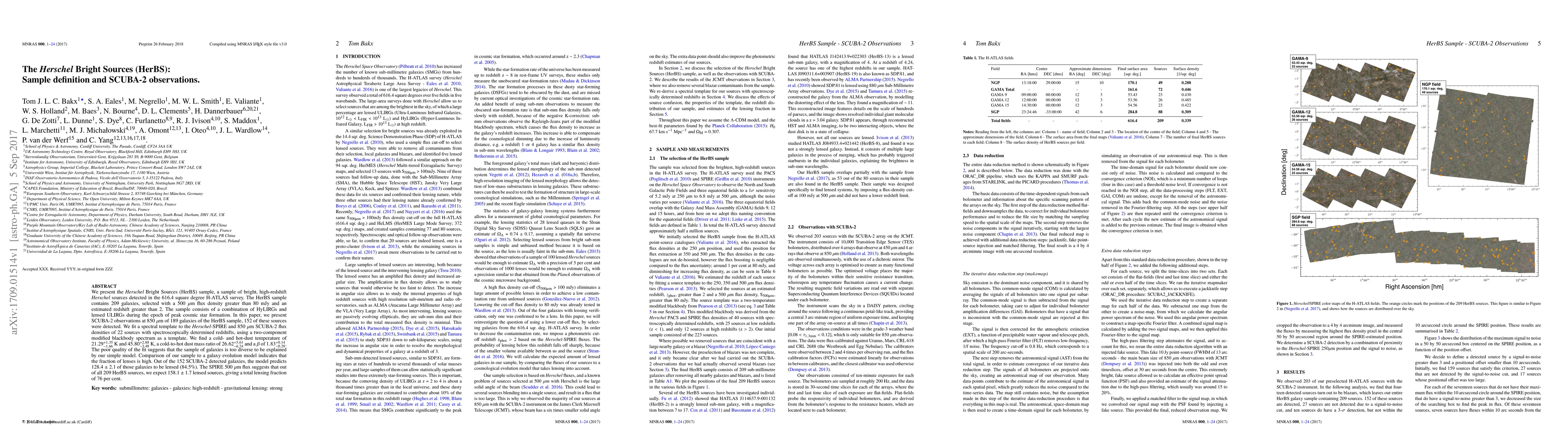 We present the Herschel Bright Sources (HerBS) sample, a sample of bright, high-redshift Herschel sources detected in the 616.4 square degree H-ATLAS survey. The HerBS sample contains 209 galaxies, selected with a 500 {\mu}m flux density greater than 80 mJy and an estimated redshift greater than 2. The sample consists of a combination of HyLIRGs and lensed ULIRGs during the epoch of peak cosmic star formation. In this paper, we present SCUBA-2 observations at 850 ${\mu}$m of 189 galaxies of the HerBS sample, 152 of these sources were detected. We fit a spectral template to the Herschel-SPIRE and 850 ${\mu}$m SCUBA-2 flux densities of 22 sources with spectroscopically determined redshifts, using a two-component modified blackbody spectrum as a template. We find a cold- and hot-dust temperature of 21.29 K and 45.80 K, a cold-to-hot dust mass ratio of 26.62 and a $\beta$ of 1.83. The poor quality of the fit suggests that the sample of galaxies is too diverse to be explained by our simple model. Comparison of our sample to a galaxy evolution model indicates that the fraction of lenses is high. Out of the 152 SCUBA-2 detected galaxies, the model predicts 128.4 $\pm$ 2.1 of those galaxies to be lensed (84.5%). The SPIRE 500 ${\mu}$m flux suggests that out of all 209 HerBS sources, we expect 158.1 $\pm$ 1.7 lensed sources, giving a total lensing fraction of 76 per cent.