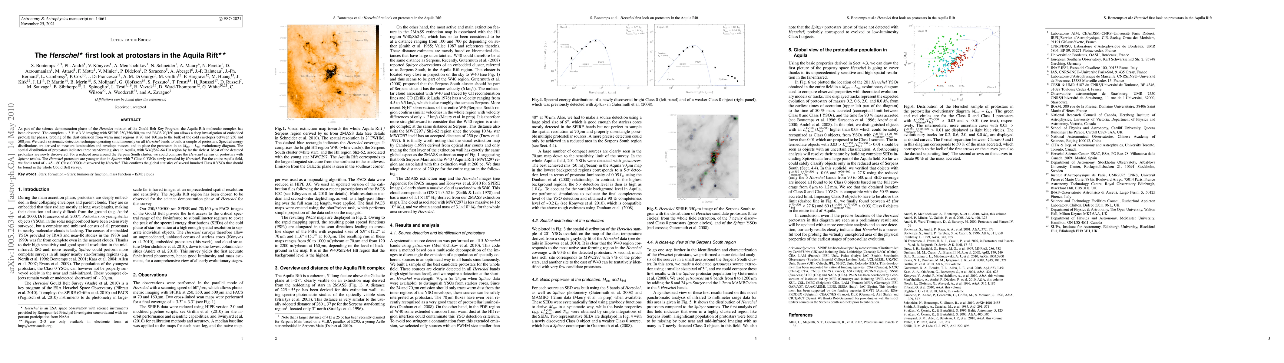 The Herschel mission conducted a comprehensive survey of the Aquila Rift molecular complex, revealing numerous previously undetected protostars and classifying them into evolutionary stages. The findings indicate three prominent star-forming regions, with the W40/Sh2-64 HII region being the most prolific, and suggest that Herschel identified younger protostars compared to Spitzer observations.