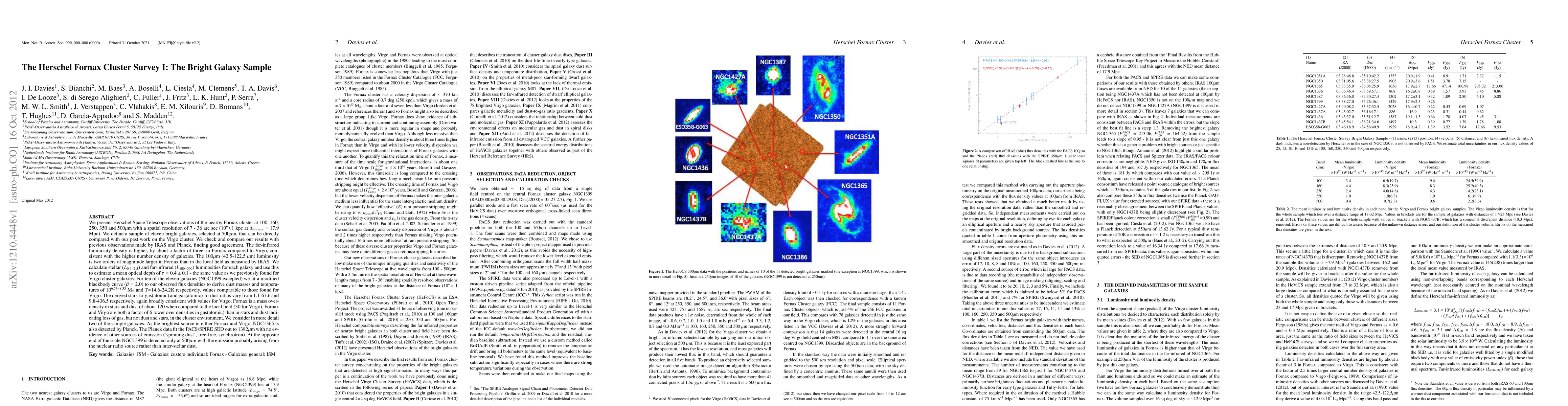 We present Herschel observations of the Fornax cluster at 100, 160, 250, 350 and 500u with a spatial resolution of 7 - 36 arc sec (10" = 1 kpc at d_Fornax=17.9 Mpc). We define a sample of 11 bright galaxies, selected at 500u, directly comparable with our past work on Virgo. We find good agreement with previous observations made by IRAS and Planck. The FIR luminosity density is higher (factor of three) in Fornax compared to Virgo. The 100u (42.5-122.5u) luminosity is two orders of magnitude larger in Fornax than in the local field as measured by IRAS. Using stellar (L_{0.4-2.5}) and FIR (L_{100-500}) luminosities we estimate a mean optical depth of tau=0.4+/-0.1 - the same value as Virgo. For 10 of the 11 galaxies (NGC1399 excepted) we fit a modified blackbody curve (beta=2.0) to the SEDs to derive dust masses and temperatures of 10^{6.54-8.35} M_0 and T=14.6-24.2K respectively, comparable to Virgo. The derived stars-to-gas(atomic) and gas(atomic)-to-dust ratios vary from 1.1-67.6 and 9.8-436.5 respectively, again consistent with Virgo. Fornax is a mass overdensity in stars and dust of about 120 compared to the local field (30 for Virgo). Fornax and Virgo are both a factor of 6 lower over densities in gas(atomic) than in stars and dust indicating loss of gas, but not dust and stars, in the cluster environment. As the brightest FIR source in either Fornax and Virgo, NGC1365 is detected by Planck. The Planck data fit the PACS/SPIRE SED out to 1382u with no evidence of other sources of emission ('spinning dust', free-free, synchrotron). At the opposite end of the scale NGC1399 is detected only at 500$\mu$m with the emission probably arising from the nuclear radio source rather than inter-stellar dust.