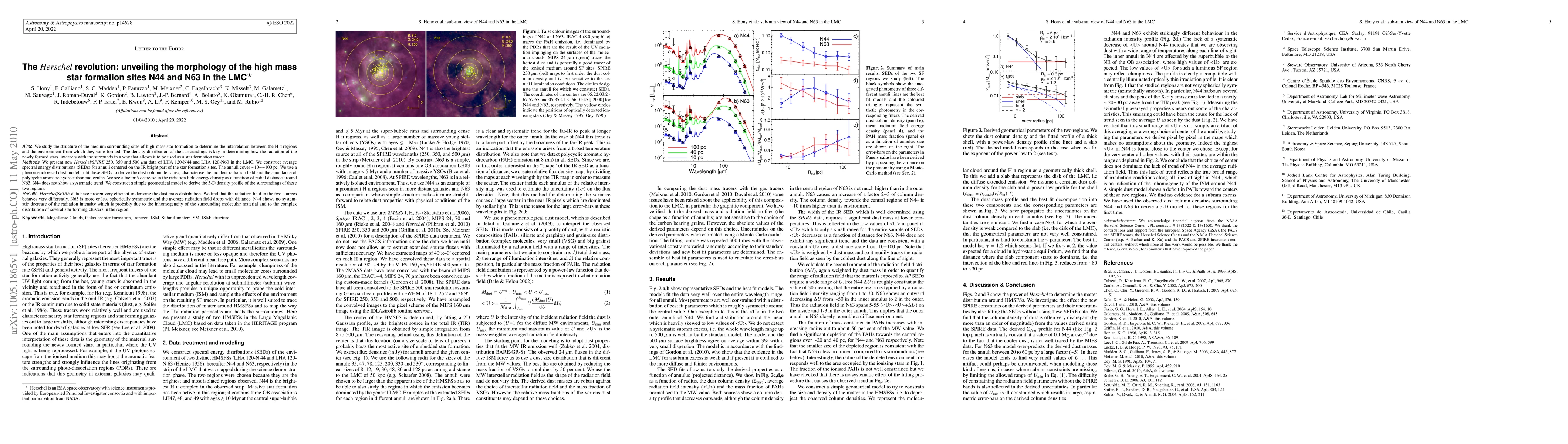 We study the structure of the medium surrounding sites of high-mass star formation to determine the interrelation between the HII regions and the environment from which they were formed. The density distribution of the surroundings is key in determining how the radiation of the newly formed stars interacts with the surrounds in a way that allows it to be used as a star formation tracer. We present new Herschel/SPIRE 250, 350 and 500 mum data of LHA 120-N44 and LHA 120-N63 in the LMC. We construct average spectral energy distributions (SEDs) for annuli centered on the IR bright part of the star formation sites. The annuli cover ~10-~100 pc. We use a phenomenological dust model to fit these SEDs to derive the dust column densities, characterise the incident radiation field and the abundance of polycyclic aromatic hydrocarbon molecules. We see a factor 5 decrease in the radiation field energy density as a function of radial distance around N63. N44 does not show a systematic trend. We construct a simple geometrical model to derive the 3-D density profile of the surroundings of these two regions. Herschel/SPIRE data have proven very efficient in deriving the dust mass distribution. We find that the radiation field in the two sources behaves very differently. N63 is more or less spherically symmetric and the average radiation field drops with distance. N44 shows no systematic decrease of the radiation intensity which is probably due to the inhomogeneity of the surrounding molecular material and to the complex distribution of several star forming clusters in the region.