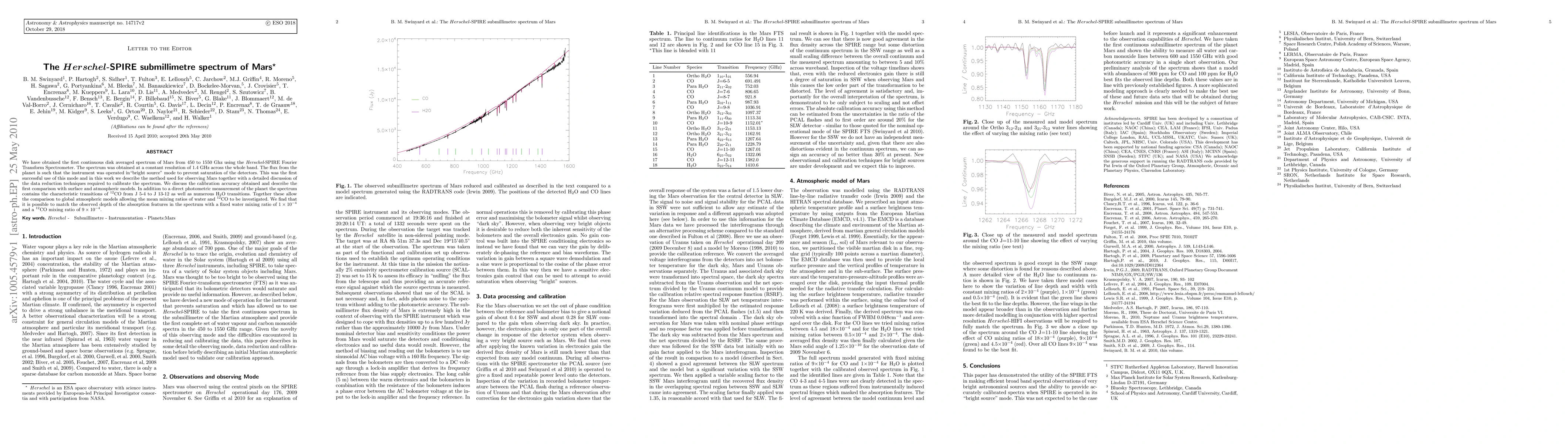 We have obtained the first continuous disk averaged spectrum of Mars from 450 to 1550 Ghz using the Herschel-SPIRE Fourier Transform Spectrometer. The spectrum was obtained at a constant resolution of 1.4 GHz across the whole band. The flux from the planet is such that the instrument was operated in "bright source" mode to prevent saturation of the detectors. This was the first successful use of this mode and in this work we describe the method used for observing Mars together with a detailed discussion of the data reduction techniques required to calibrate the spectrum. We discuss the calibration accuracy obtained and describe the first comparison with surface and atmospheric models. In addition to a direct photometric measurement of the planet the spectrum contains the characteristic transitions of 12CO from J 5-4 to J 13-12 as well as numerous H2O transitions. Together these allow the comparison to global atmospheric models allowing the mean mixing ratios of water and 12CO to be investigated. We find that it is possible to match the observed depth of the absorption features in the spectrum with a fixed water mixing ratio of 1 x 10-4 and a 12CO mixing ratio of 9 x 10-4