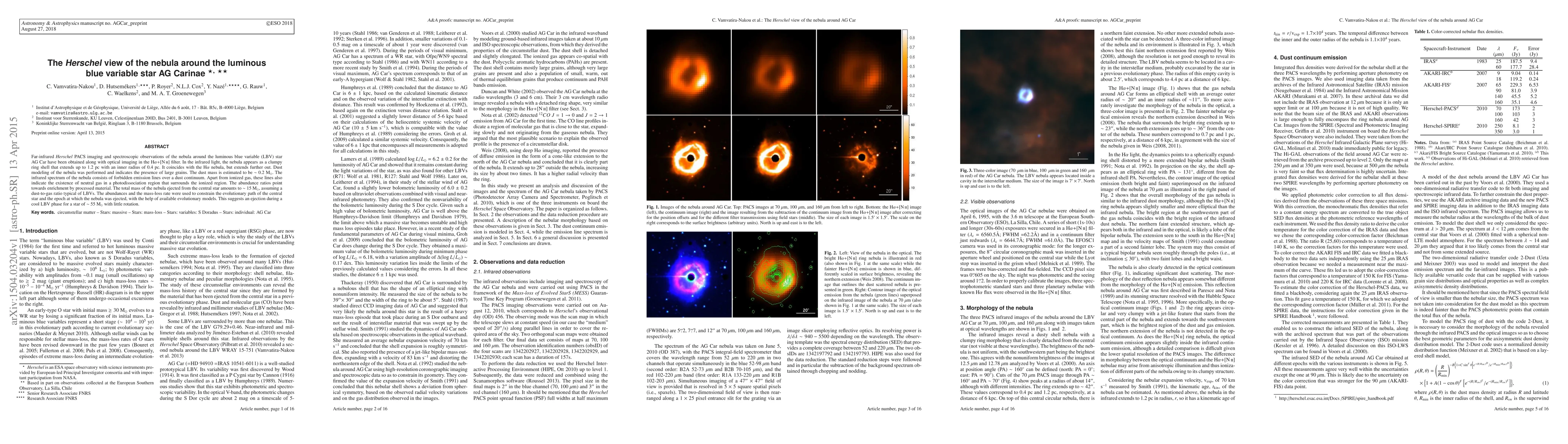 The Herschel observations reveal a clumpy ring nebula around the LBV star AG Carinae, extending up to 1.2 pc and containing an estimated dust mass of ~0.2 Msun. The nebula's infrared spectrum indicates the presence of both ionized and neutral gas, suggesting ejection during a cool LBV phase for a star of ~55 Msun.