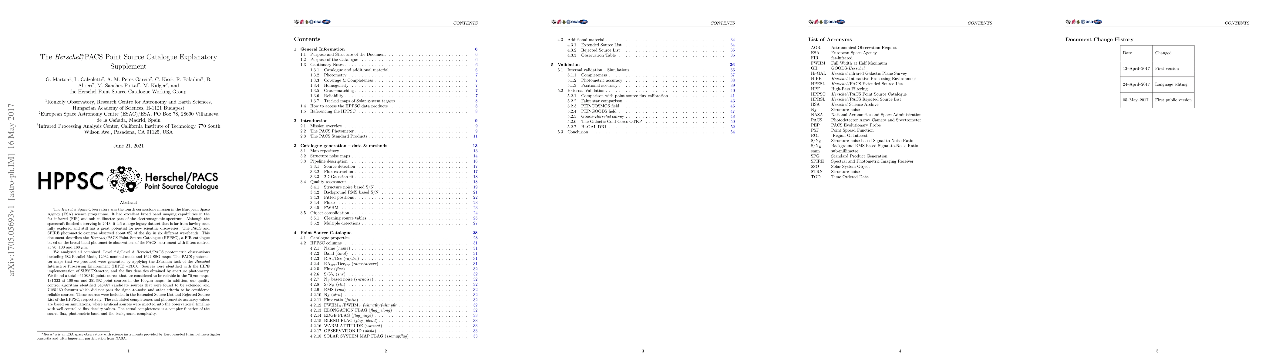 This paper presents the Herschel/PACS Point Source Catalogue (HPPSC), detailing the identification and analysis of 108,319 to 251,392 reliable point sources in the far-infrared from PACS instrument observations, with additional extended and rejected sources catalogued separately. Photometric accuracy and completeness are assessed through simulations.