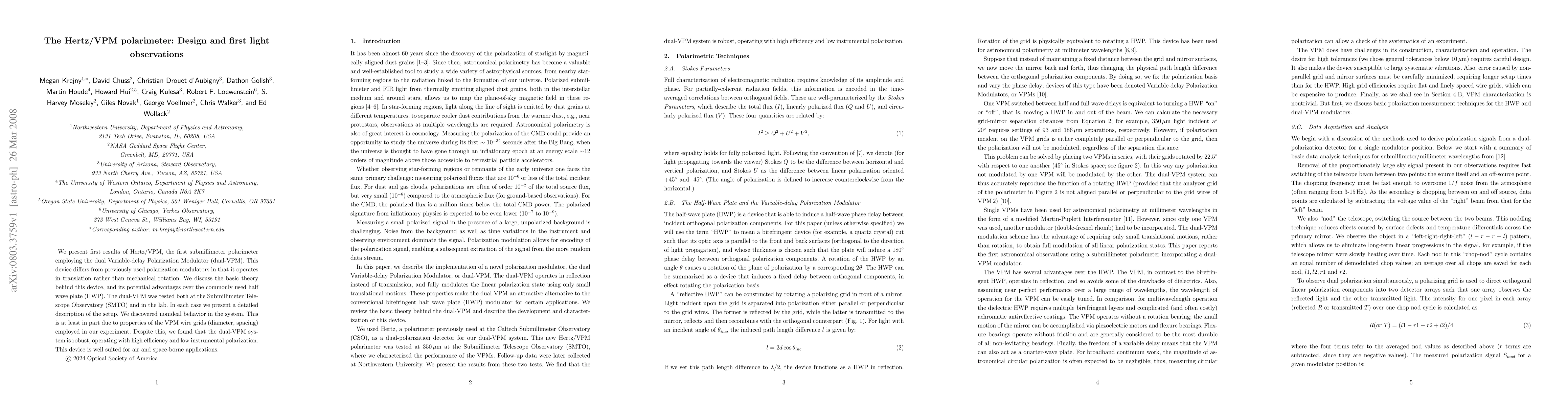 We present first results of Hertz/VPM, the first submillimeter polarimeter employing the dual Variable-delay Polarization Modulator (dual-VPM). This device differs from previously used polarization modulators in that it operates in translation rather than mechanical rotation. We discuss the basic theory behind this device, and its potential advantages over the commonly used half wave plate (HWP). The dual-VPM was tested both at the Submillimeter Telescope Observatory (SMTO) and in the lab. In each case we present a detailed description of the setup. We discovered nonideal behavior in the system. This is at least in part due to properties of the VPM wire grids (diameter, spacing) employed in our experiment. Despite this, we found that the dual-VPM system is robust, operating with high efficiency and low instrumental polarization. This device is well suited for air and space-borne applications.