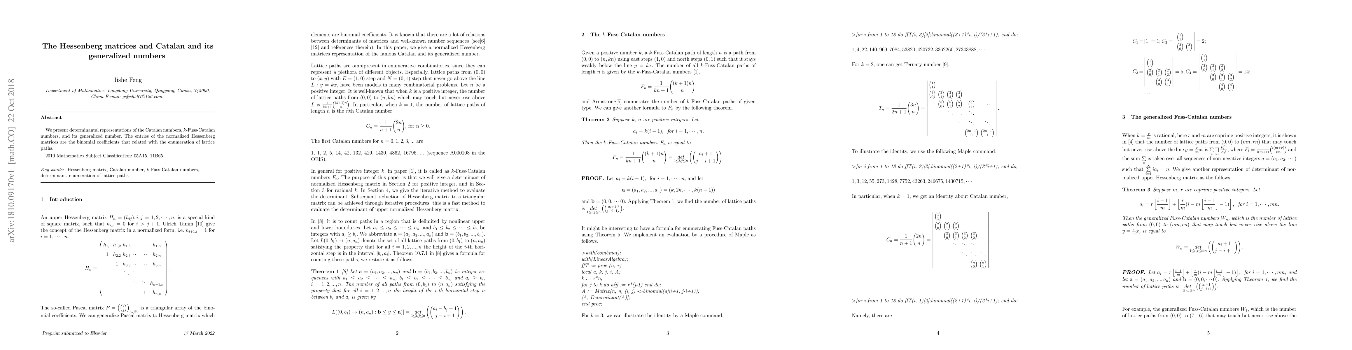 Summary: This paper provides determinantal representations for Catalan numbers, k-Fuss-Catalan numbers, and their generalizations using normalized Hessenberg matrices whose entries are binomial coefficients linked to lattice path enumeration.