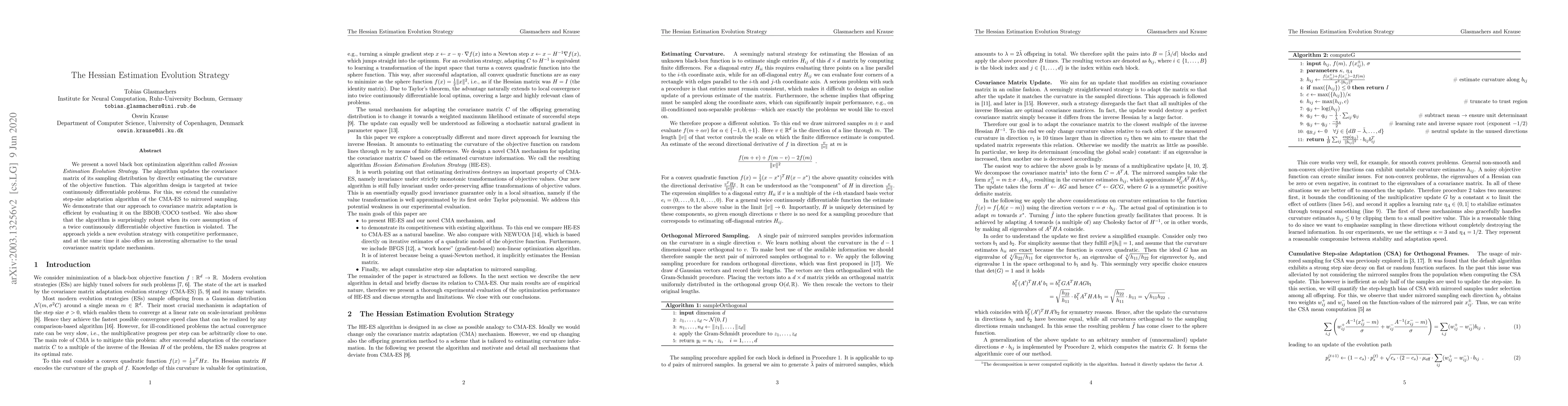 A new optimization algorithm called Hessian Estimation Evolution Strategy updates its sampling distribution's covariance matrix by estimating the curvature of the objective function, offering competitive performance on a testbed while being robust to non-continuously differentiable functions.