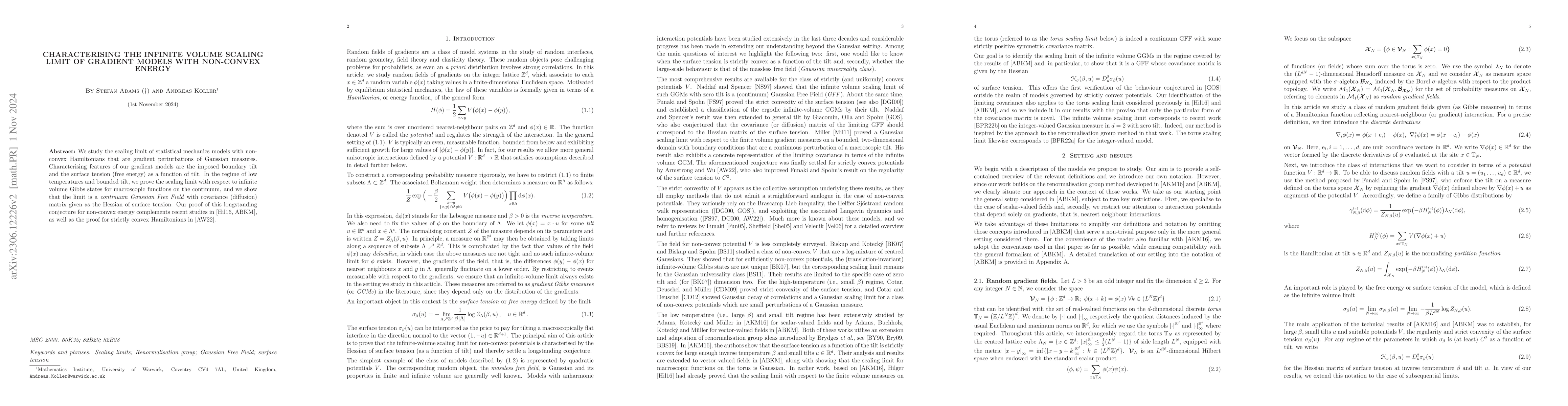 This paper investigates the scaling limit of statistical mechanics models with non-convex Hamiltonians, proving that the limit is a continuum Gaussian Free Field. The Hessian of surface tension characterizes the covariance matrix of this limit, complementing recent studies.