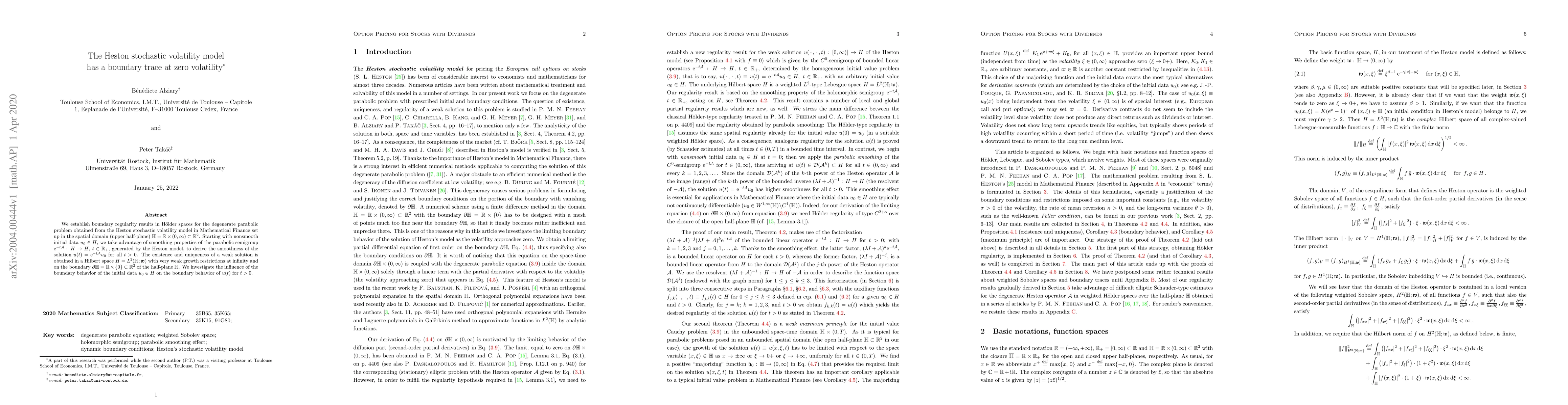 We establish boundary regularity results in H\"older spaces for the degenerate parabolic problem obtained from the Heston stochastic volatility model in Mathematical Finance set up in the spatial domain (upper half-plane) $\mathbb{H} = \mathbb{R}\times (0,\infty)\subset \mathbb{R}^2$. Starting with nonsmooth initial data $u_0\in H$, we take advantage of smoothing properties of the parabolic semigroup $\mathrm{e}^{-t\mathcal{A}}\colon H\to H$, $t\in \mathbb{R}_+$, generated by the Heston model, to derive the smoothness of the solution $u(t) = \mathrm{e}^{-t\mathcal{A}} u_0$ for all $t>0$. The existence and uniqueness of a weak solution is obtained in a Hilbert space $H = L^2(\mathbb{H};\mathfrak{w})$ with very weak growth restrictions at infinity and on the boundary $\partial\mathbb{H} = \mathbb{R}\times \{ 0\}\subset \mathbb{R}^2$ of the half-plane $\mathbb{H}$. We investigate the influence of the boundary behavior of the initial data $u_0\in H$ on the boundary behavior of $u(t)$ for $t>0$.